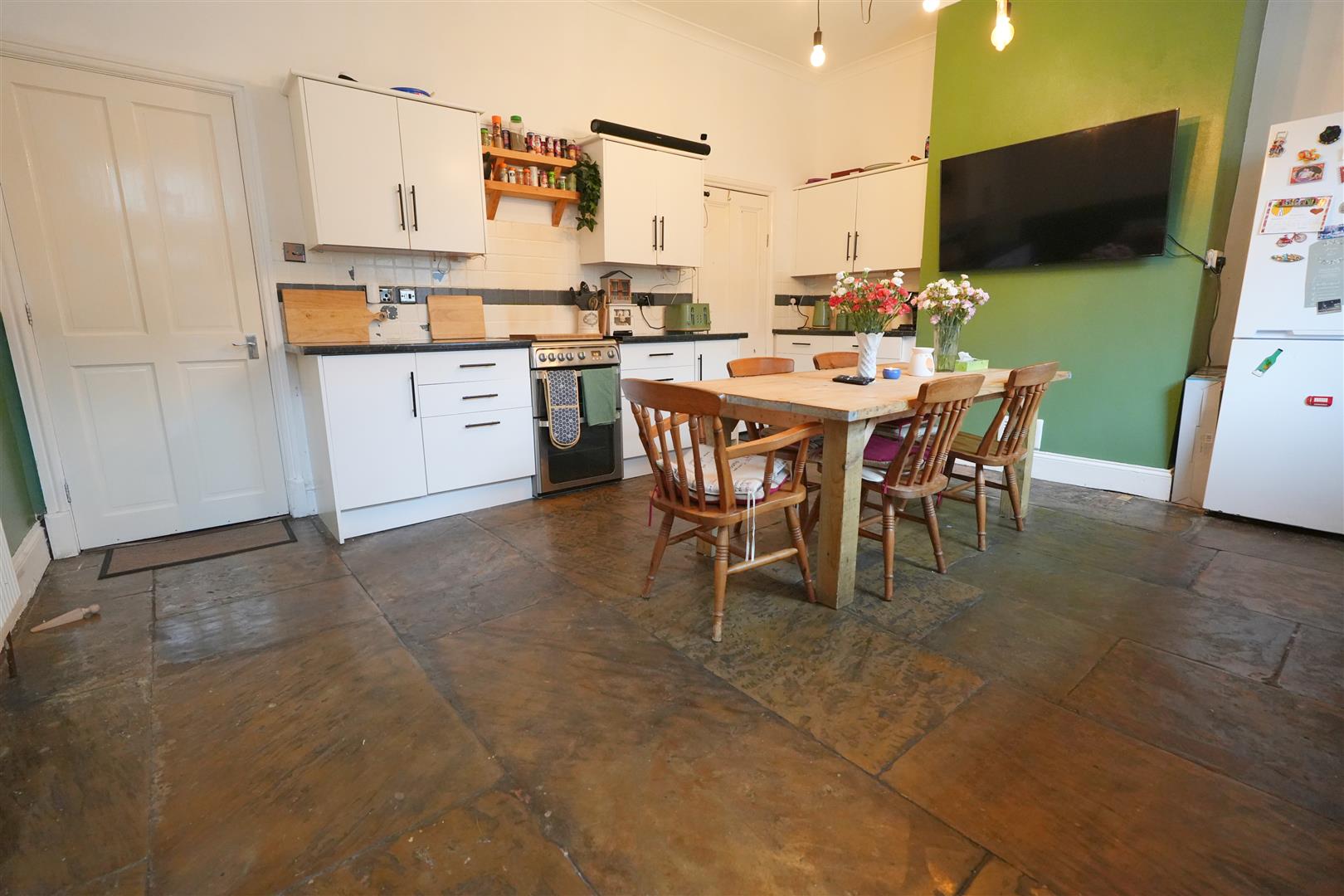 Kitchen/Dining Room - 4.357 x 5.238 (14'3" x 17'2") - Fitted kitchen with wall and base units. Ceramic one and a half bowl sink. Gas cooker. Access to cellar. Yorkshire flagged floor. Boiler installed in 2023 (full service history). Radiator. UPVC double glazed door to rear elevation. Double glazed window to rear elevation.