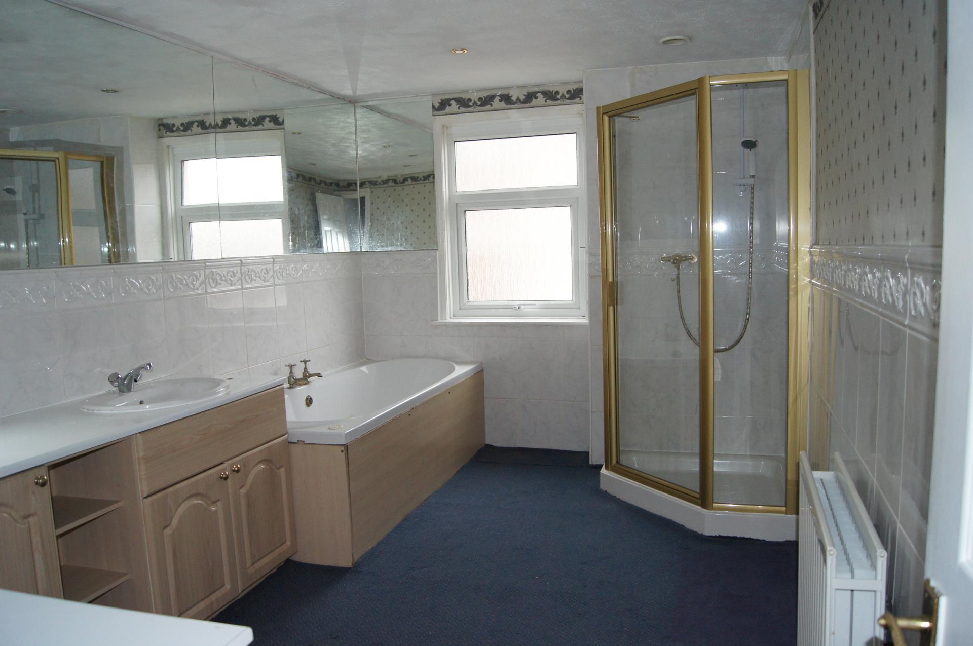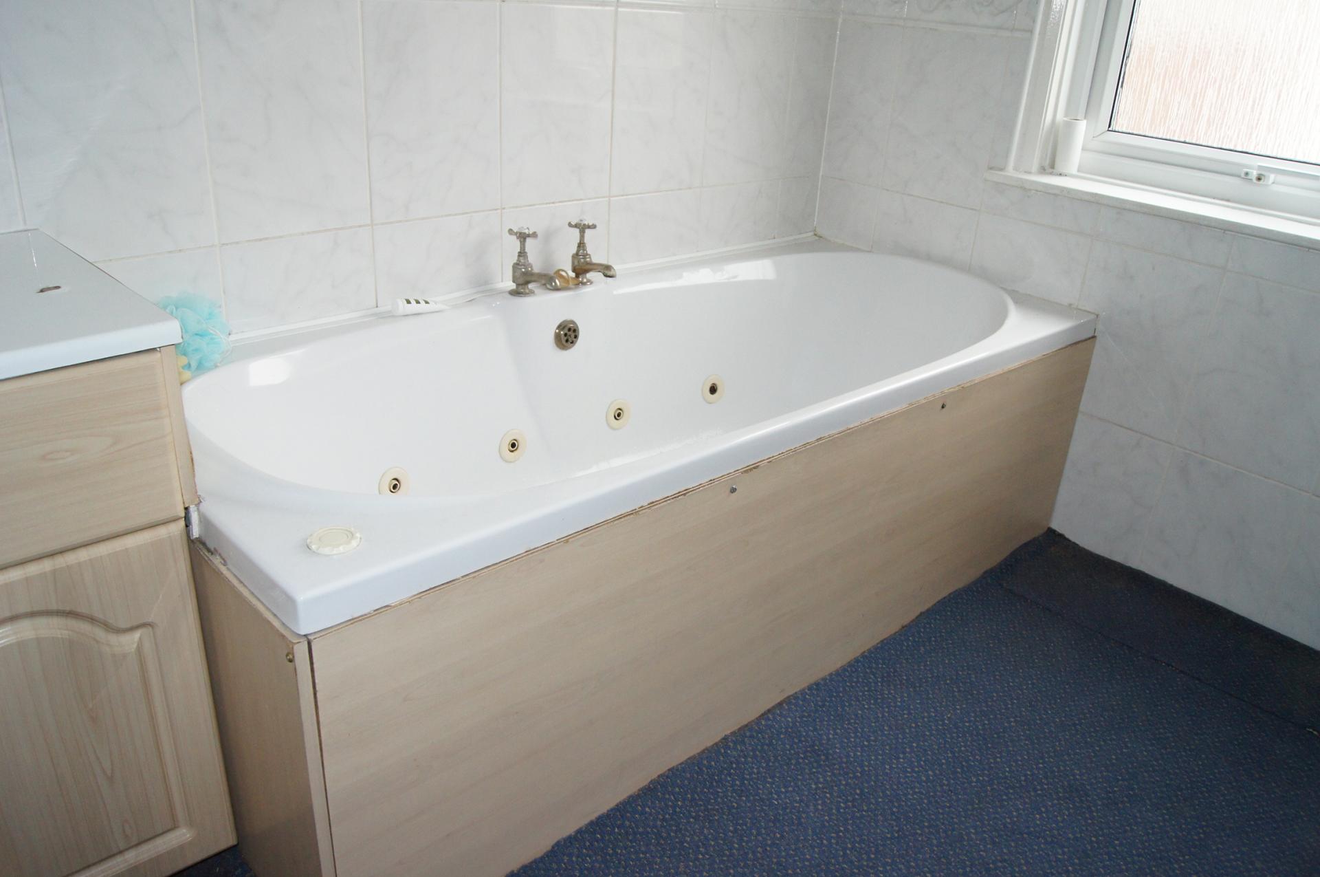 The bathroom suite is white comprises panelled spa bath, vanity unit wash hand basin with white high gloss top. Low level concealed wc. Half tiled walls with border. Extractor fan. Step in mains fed shower. Spot lights in ceiling. Double radiator. Rear and side aspect obscured windows.