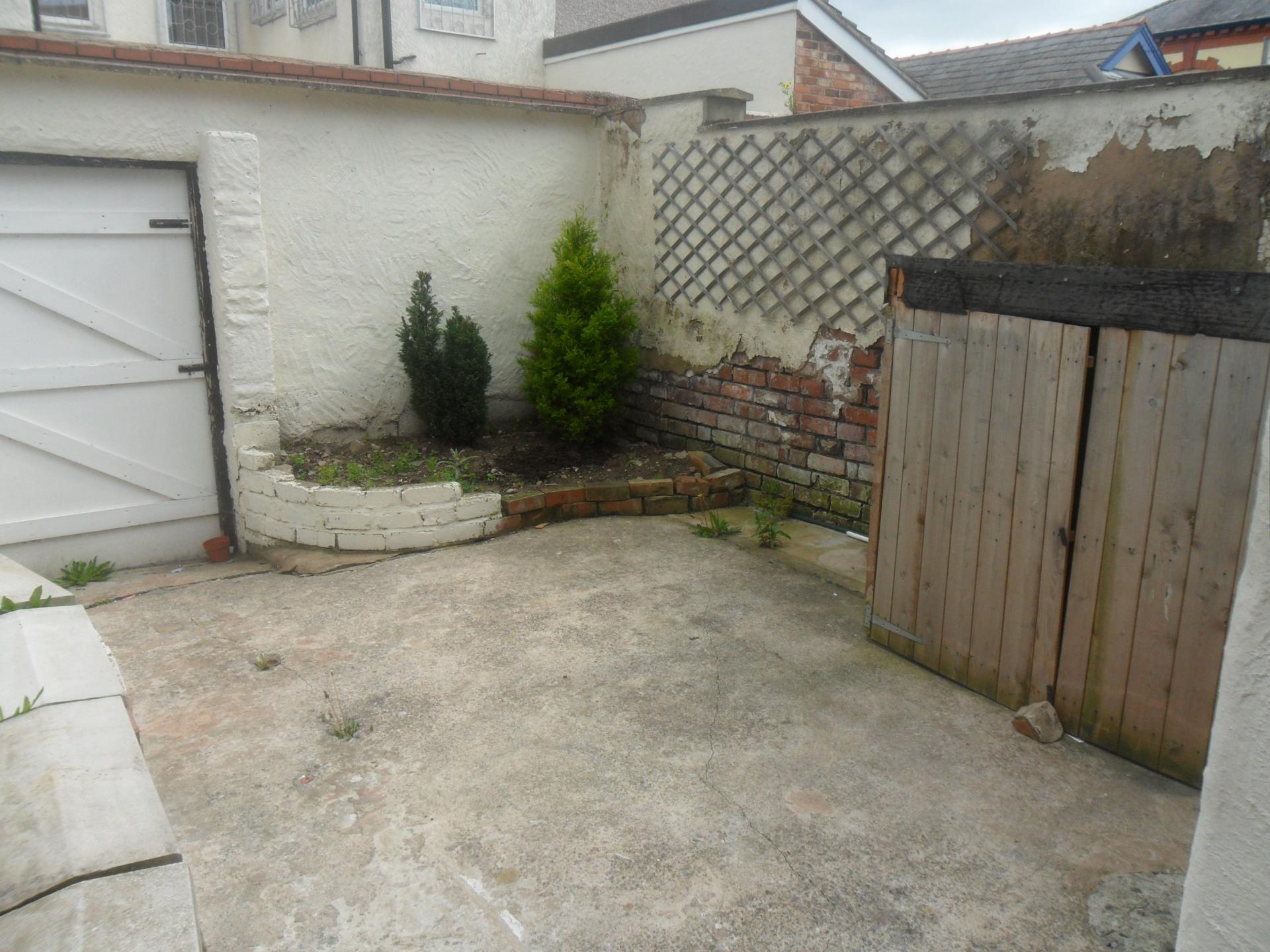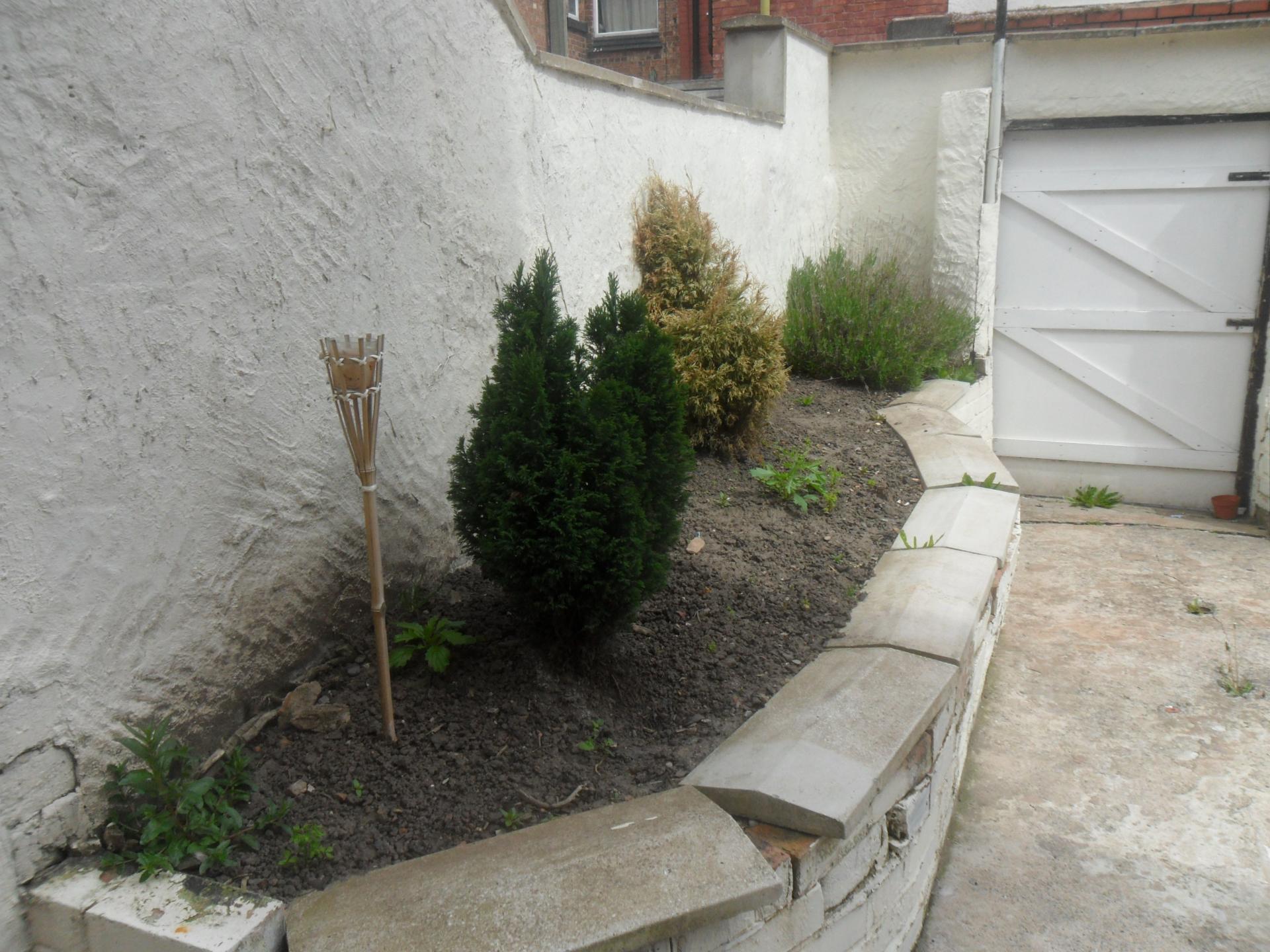 Brick boundary wall with wooden gate. Raised flower borders. Brick boundary wall. Concrete pathway. Various plants and shrubs.