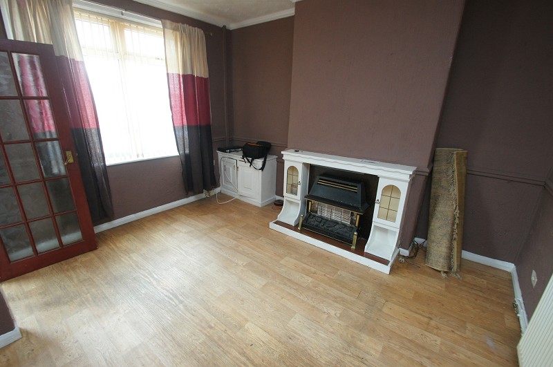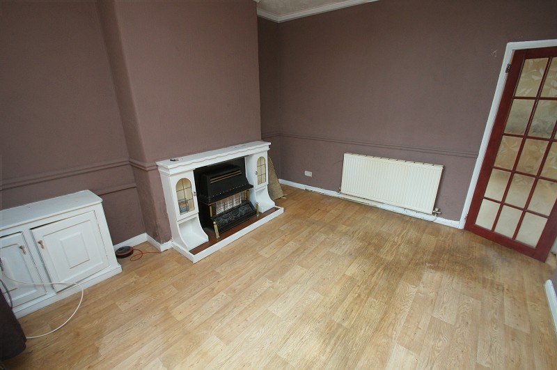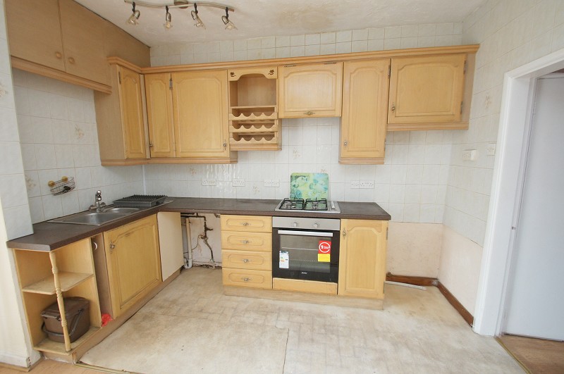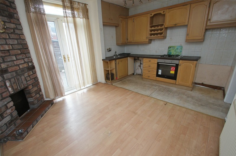 UPVC double glazed window overlooks the rear elevation and UPVC double glazed french doors open out onto the same. Partially tiled kitchen with a range of wooden wall and base units with integrated gas hob and electric oven. Stainless steel sink with mixer tap over, space and points for fridge freezer and washing machine. Good sized dining area with radiator and feature fireplace. Access through the French Doors into the rear yard