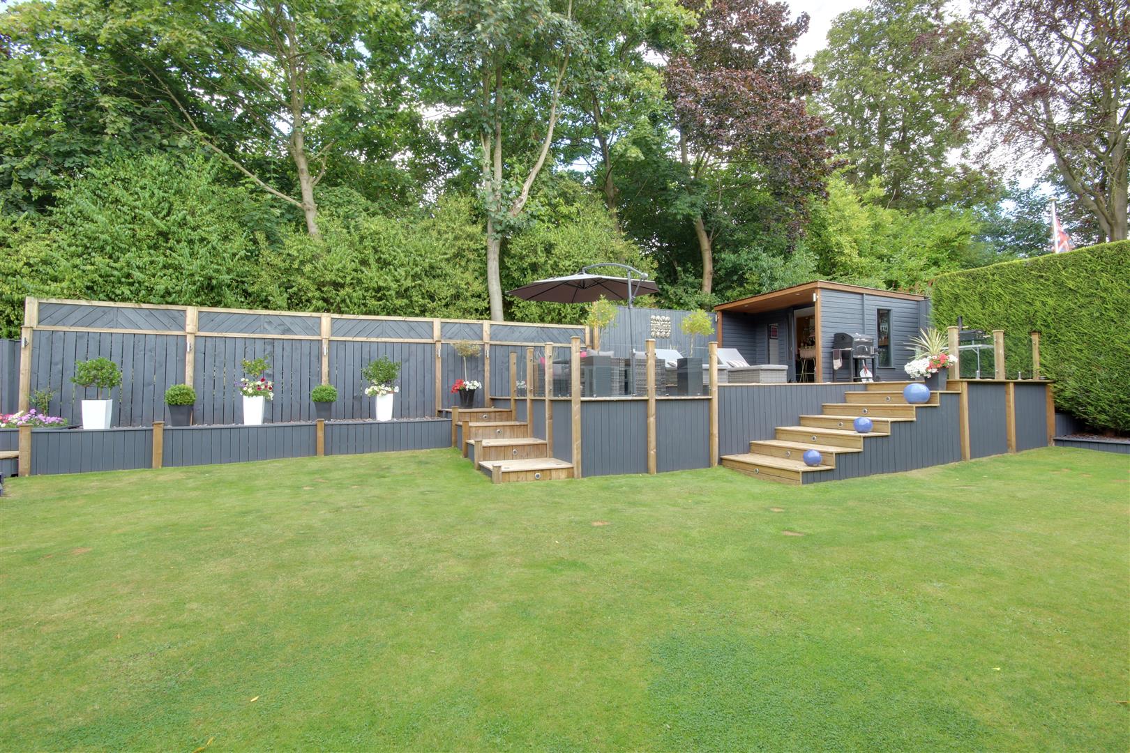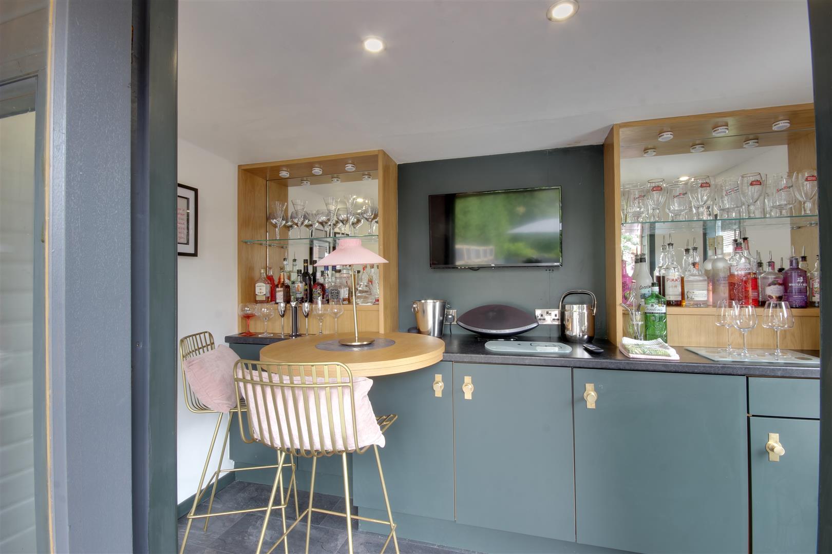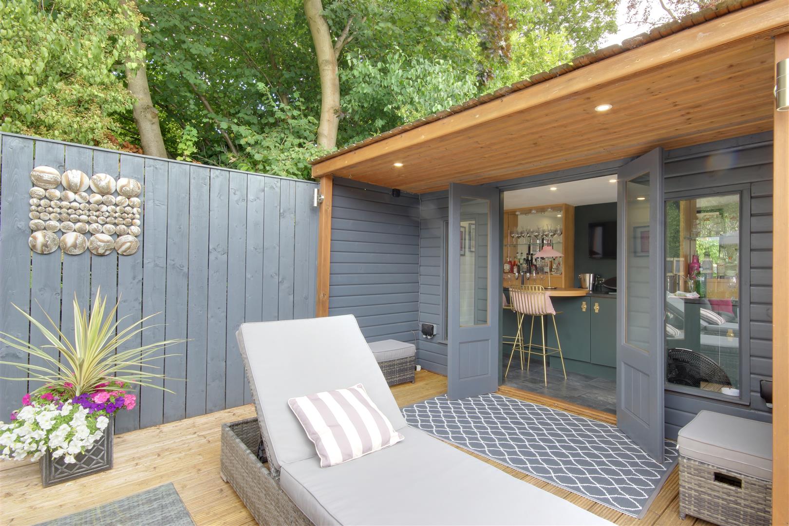 Outside - Externally to the front, there is a lawned garden and driveway providing off street parking. The double garage has been converted as part of the modernisation, however the front section has been retained for use as a store. The enclosed rear garden is mainly lawned bounded by mature borders which provide much privacy. A particular feature is the garden chalet and large raised sun deck perfectly placed to enjoy the afternoon and evening sun. An ideal entertaining spot with solar lights built into the decking, the chalet has been fitted with units, bar area, inset spot lights, electric outdoor heaters and there is also space for a fridge.
