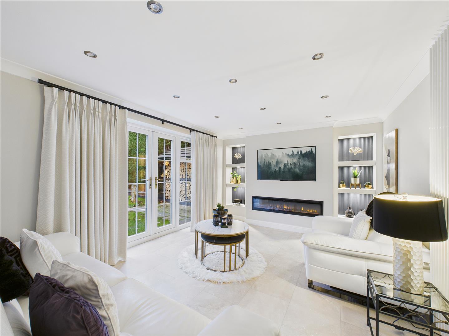 Sitting Room - 4.85m x 2.49m(extending to 3.38m) approx (15'11" x - With double doors to the garden, Travertine tiled flooring with underfloor heating, inset spot lights, designer radiator. Media wall with inset TV point. Contemporary fireplace and shelving to sides.