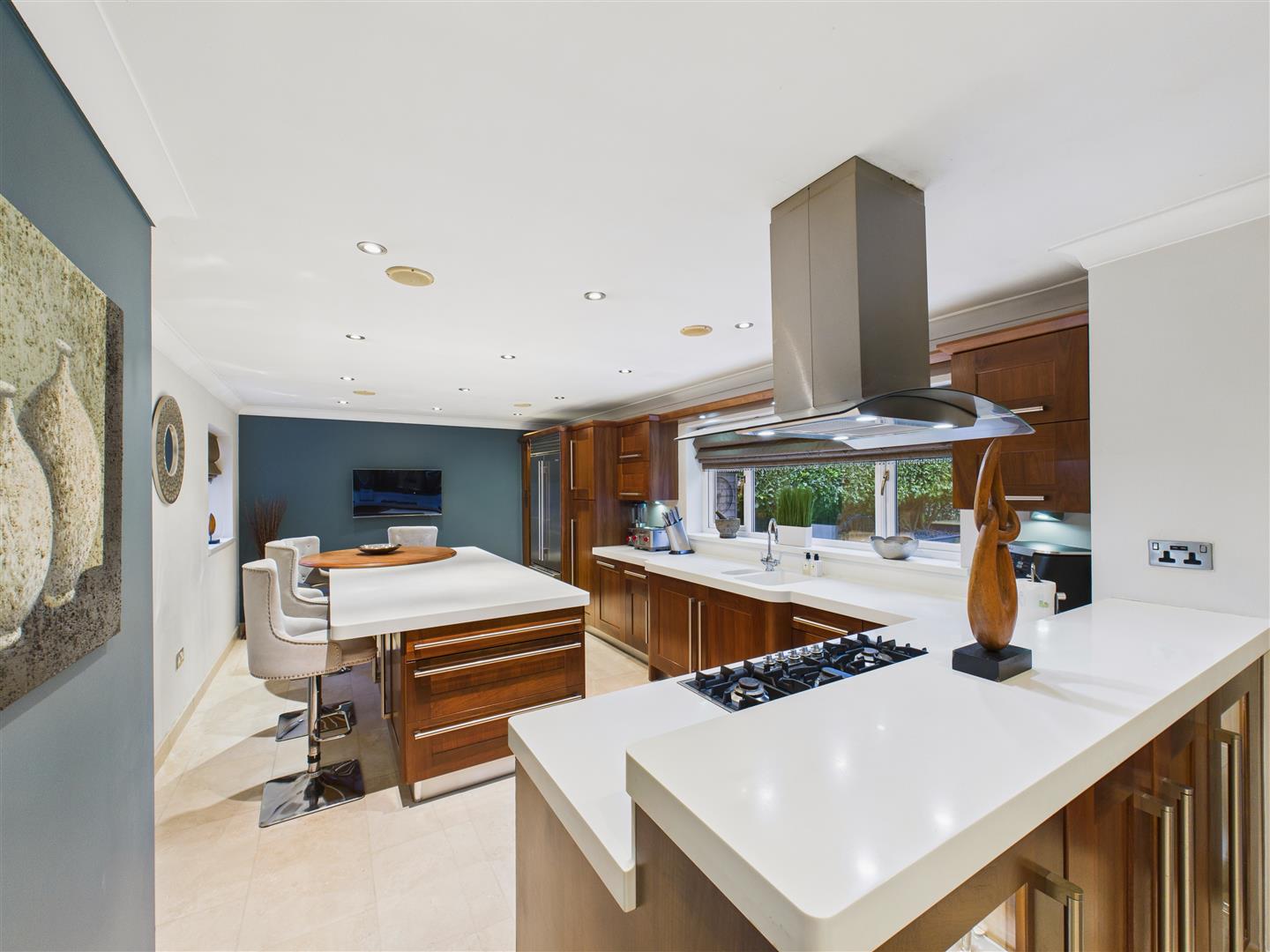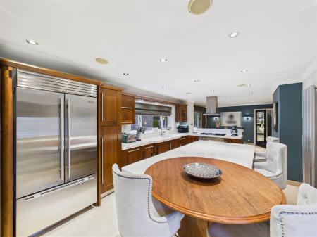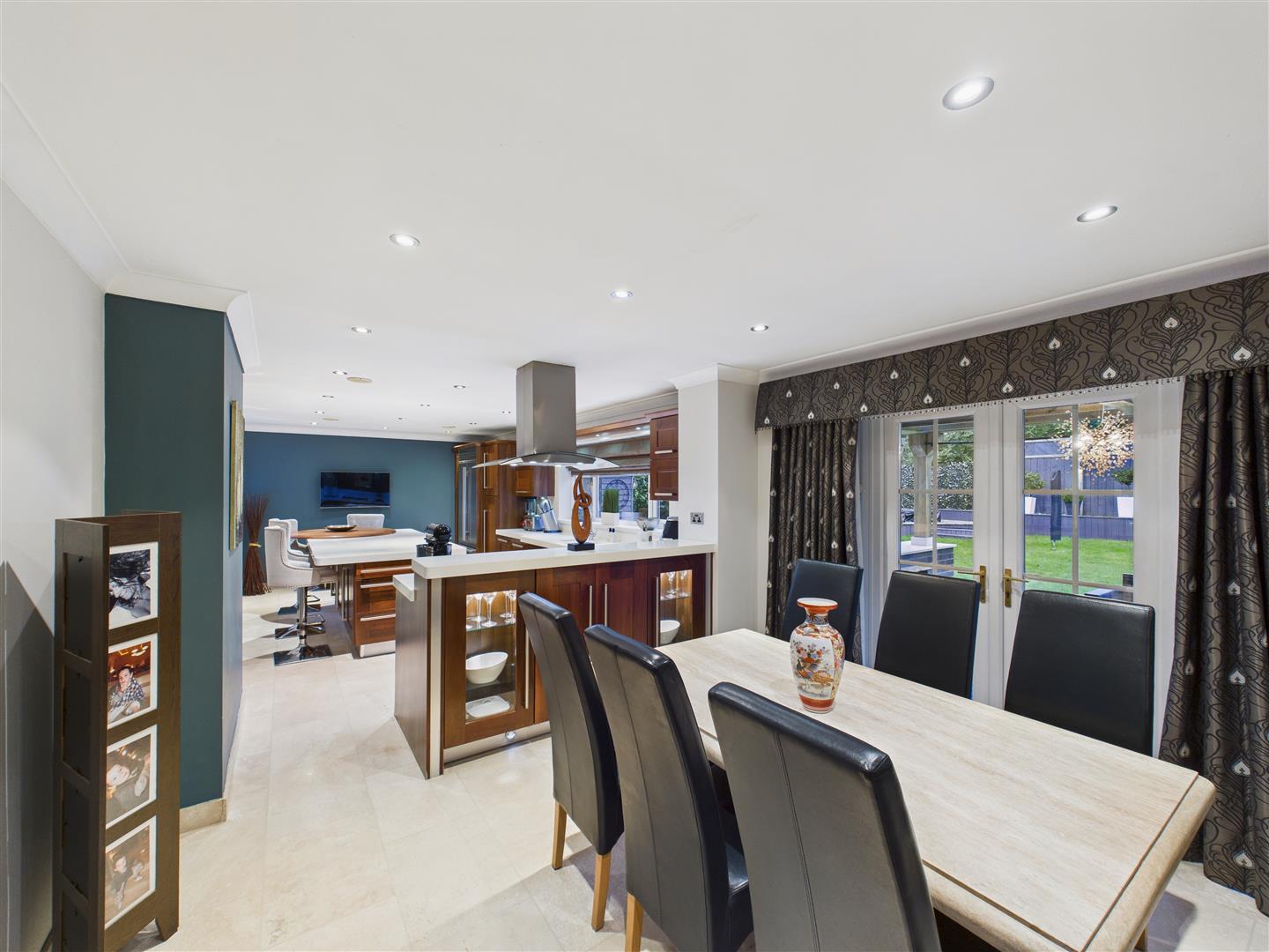 Open Plan Dining Kitchen - 9.63m x 3.61m approx (31'7" x 11'10" approx) - Situated at the rear of the house this room has windows and double doors leading to the "outdoor lounge" with garden beyond. The kitchen features an extensive range of base and wall mounted units complemented by Corian worksurfaces and matching island together with breakfast bar peninsular. There is an under-counter one and a half sink and integrated appliances include a double oven, microwave, five ring gas hob with chimney style extractor hood over, dishwasher, space for American style fridge freezer. There is Travertine tiling to the floor with underfloor heating and a wall mounted TV point.
