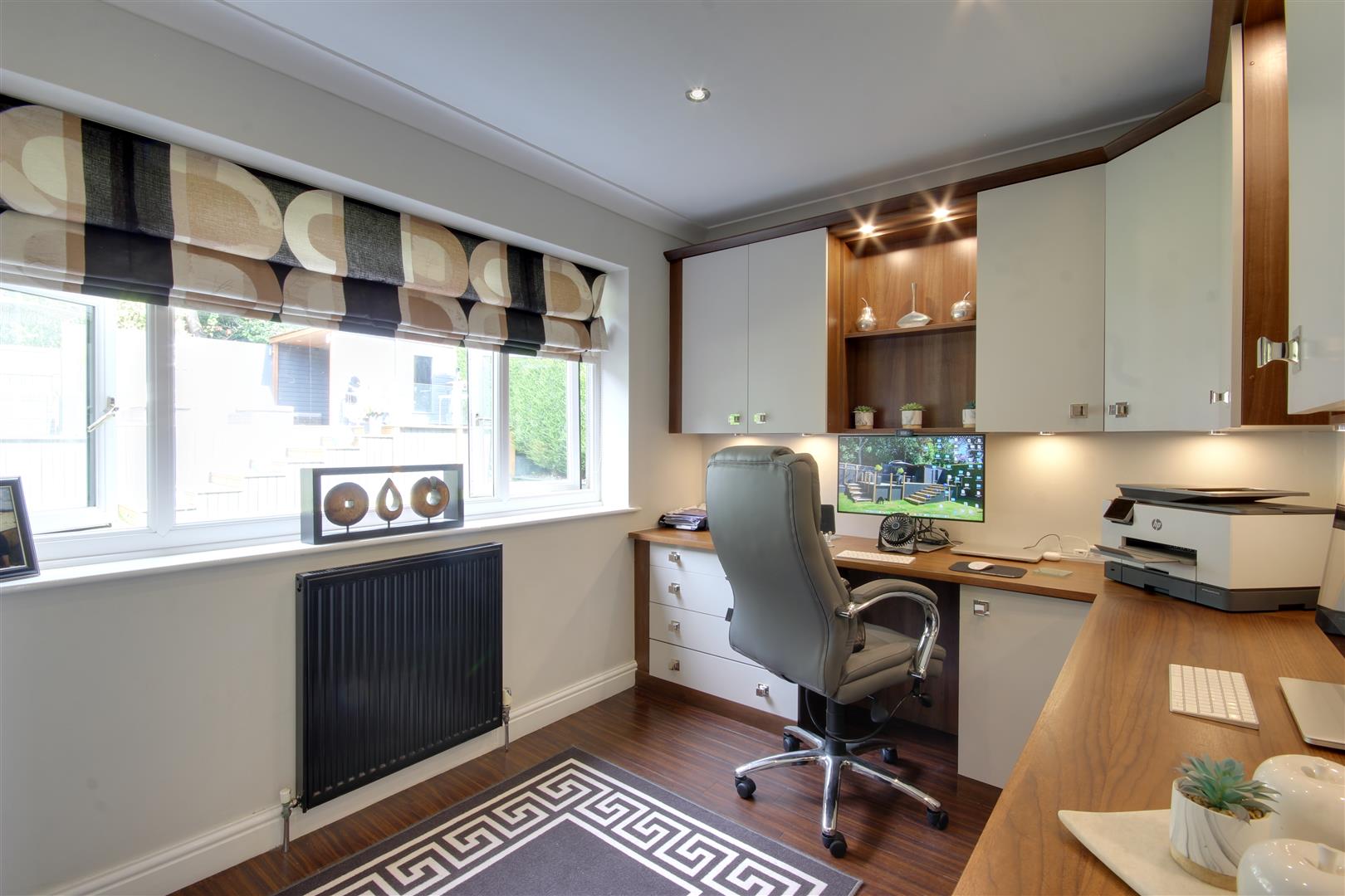 Study - 3.56m x 2.49m approx (11'8" x 8'2" approx) - With a range of quality fitted units, cupboards and workstation, feature flooring and window to rear elevation.