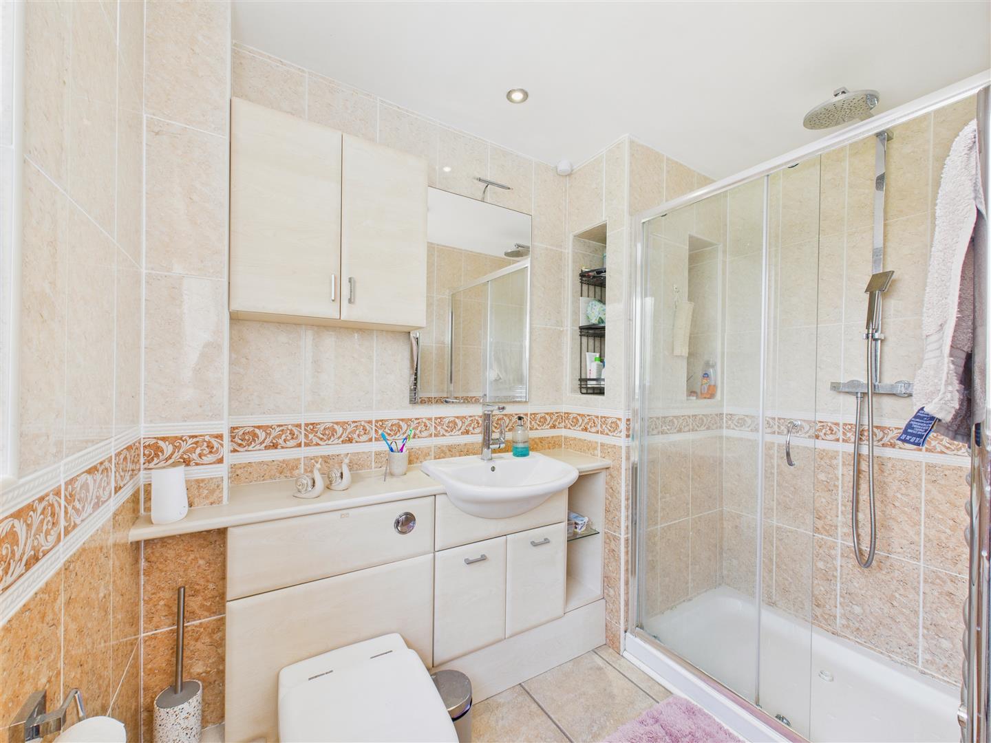 En-Suite Shower Room - With suite comprising a shower enclosure, vanity unit with wash hand basin and low flush W.C. Tiling to walls, window to front.