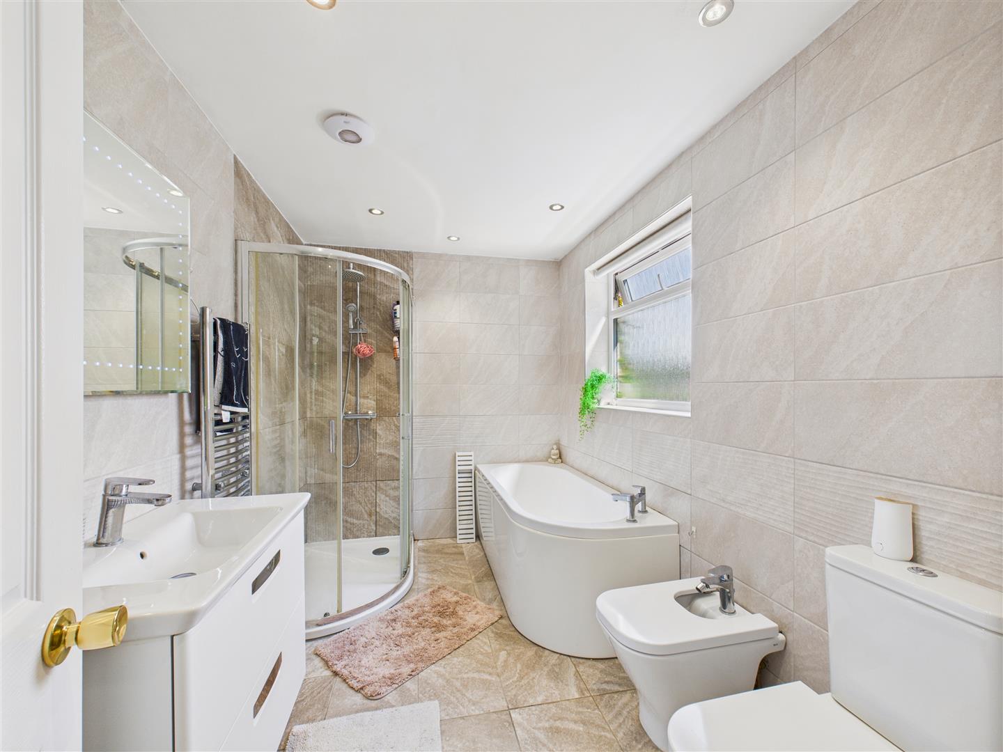 Bathroom - With stylish suite comprising a bath, separate shower enclosure, vanity unit with wash hand basin, low flush W.C. and bidet. Tiling to walls and floor, inset spot lights and window to the front elevation.