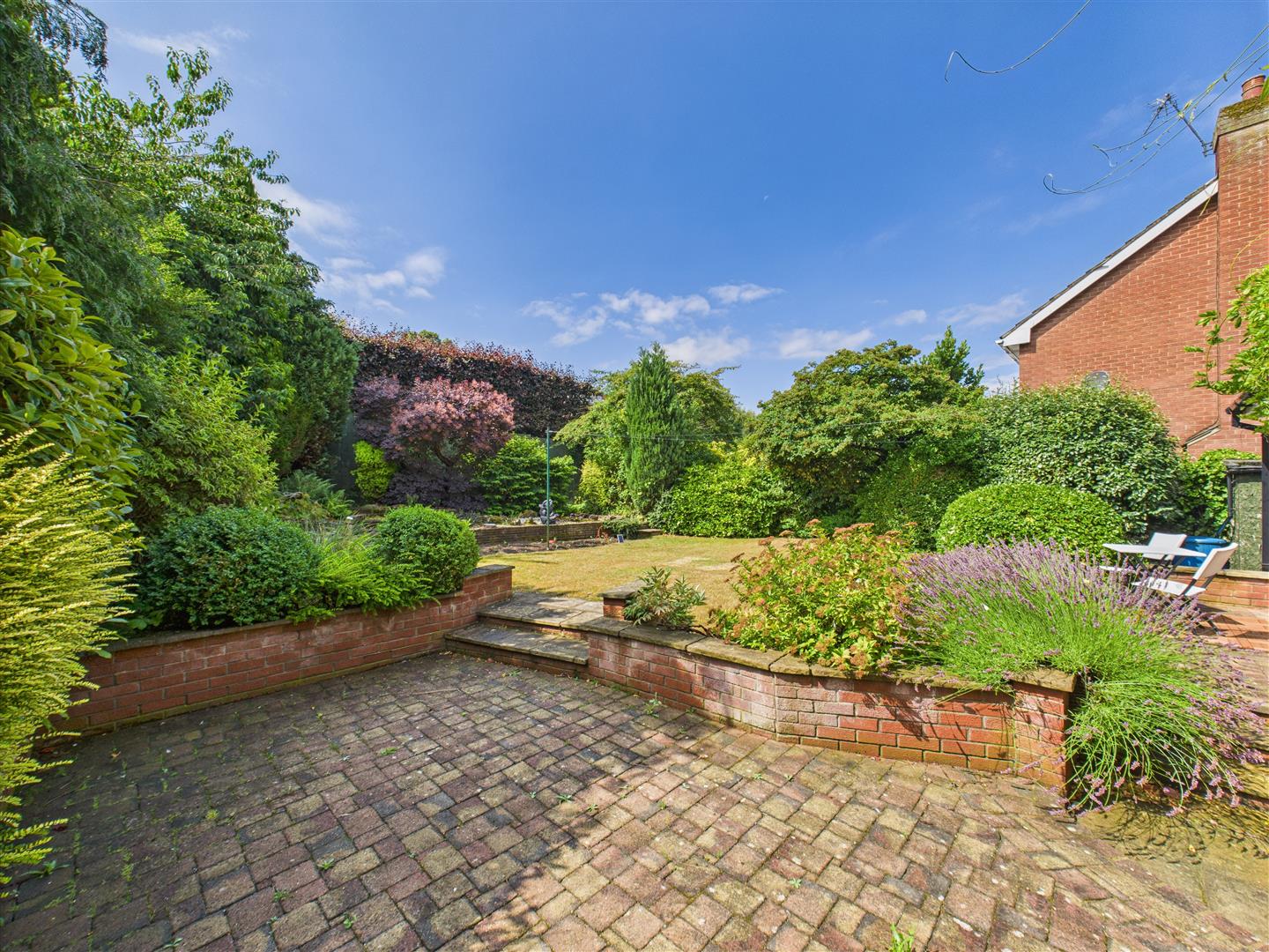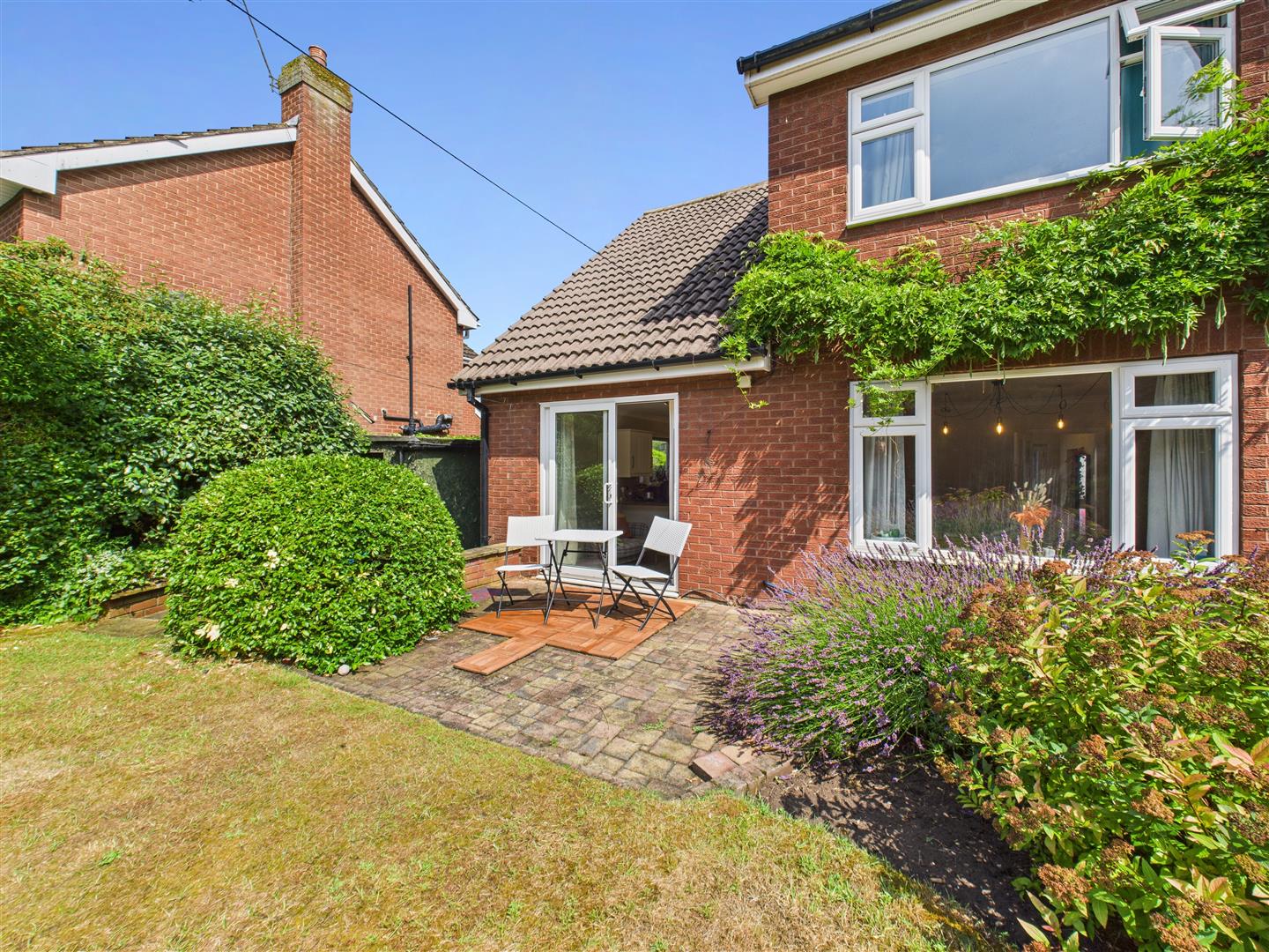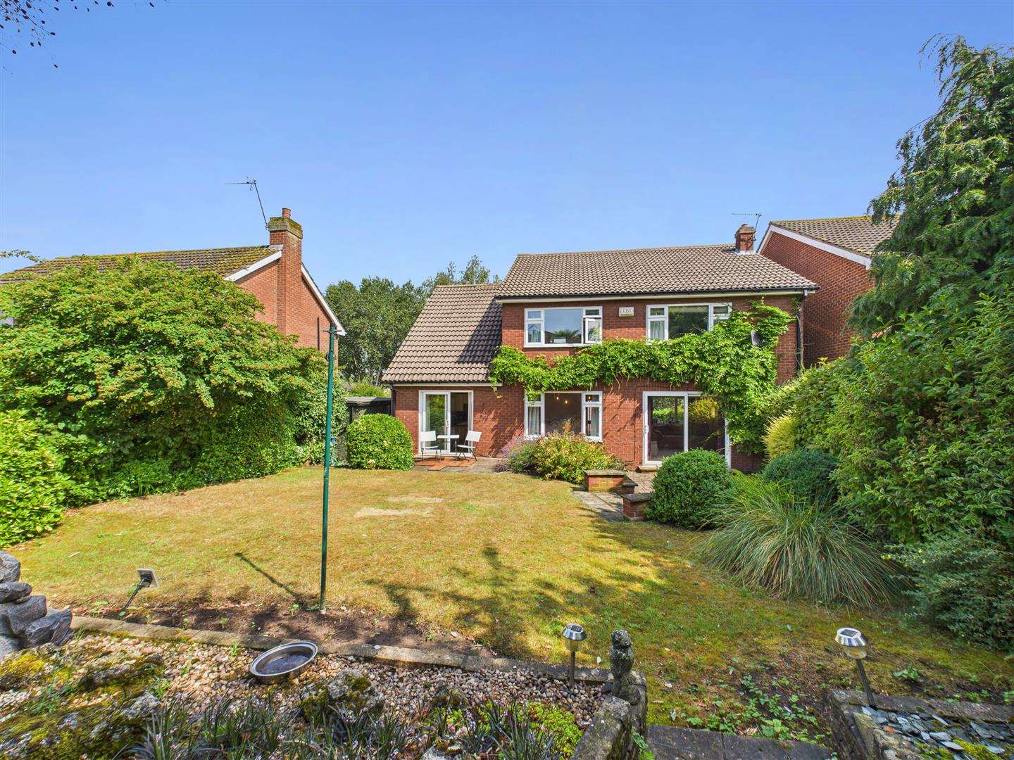Outside - The property boasts a generous plot, with the house thoughtfully set back from the road. An extensive driveway provides ample parking and leads to the double garage, complete with a convenient car charging port. The southerly facing rear garden is bounded by mature hedged borders and features a lawn, patio areas and well stocked flowerbeds.