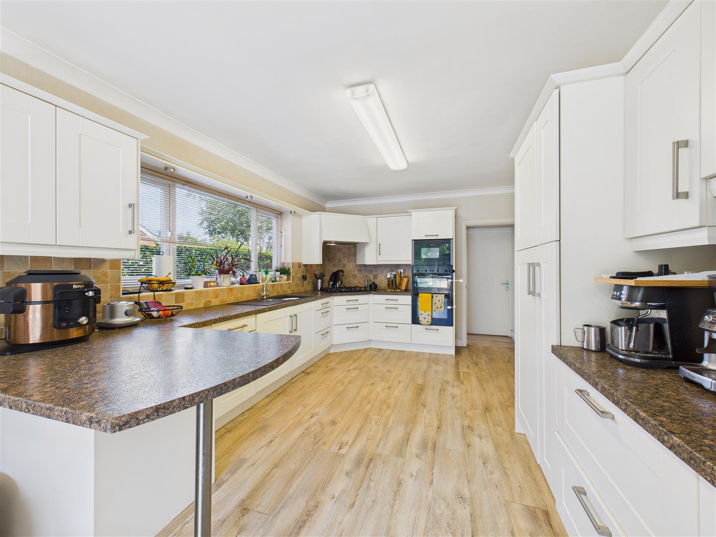 Living Kitchen - Having a range of shaker style base and wall units with laminate worktops incorporating a one and a half bowl sink and drainer, double oven, microwave, five ring gas hob with extractor above, larder fridge and dishwasher. There is a breakfast bar area and further space for living or dining with patio doors leading out to the rear garden.