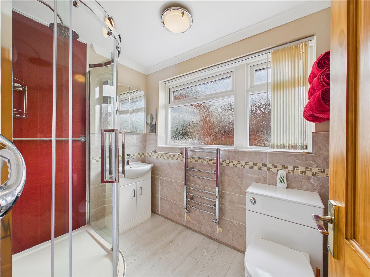 Shower Room - With modern suite comprising a shower enclosure, vanity unit with wash hand basin and low flush W.C. Part tiling to walls, heated towel rail and window to side.