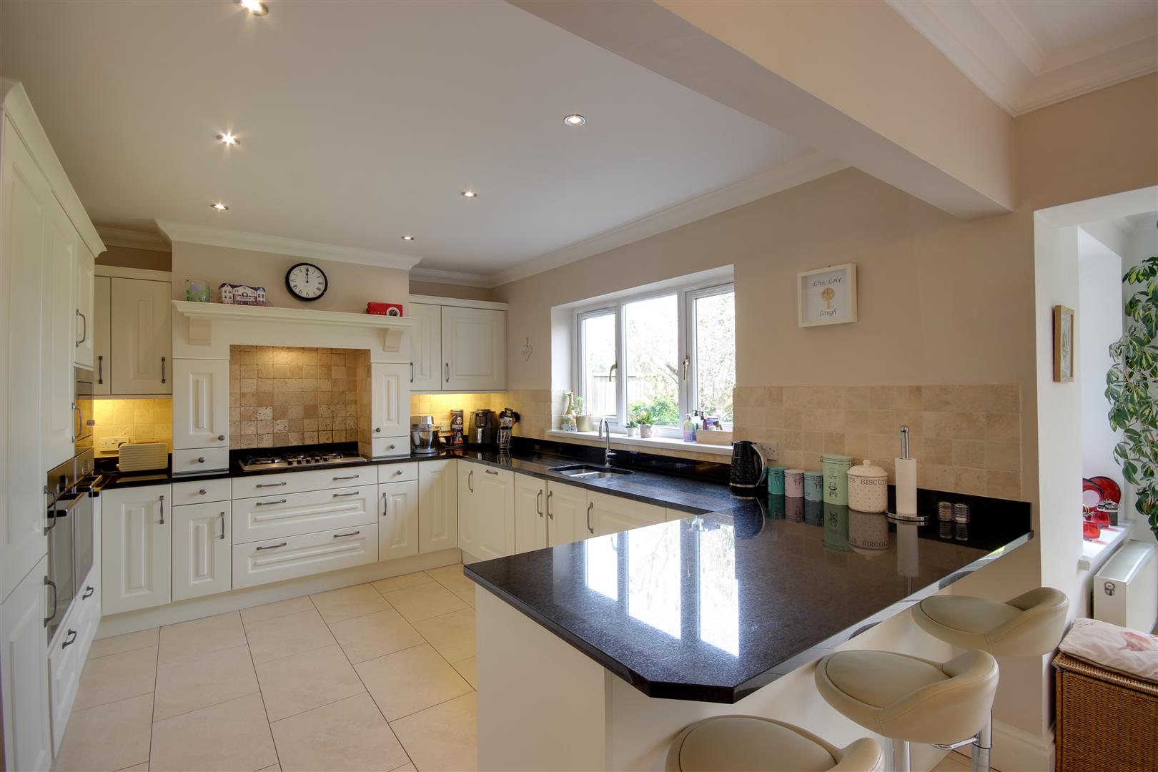 Kitchen Area - 3.89m x 3.35m approx (12'9" x 11'0" approx) - Open plan in style from the dining area. The kitchen features a range of fitted base and wall mounted units with granite work surfaces and integrated twin ovens, microwave 5 ring gas hob, concealed extractor hood above, dishwasher, fridge freezer. There is an undercounter one and a half sink with mixer tap, tiling to the floor, window to rear.