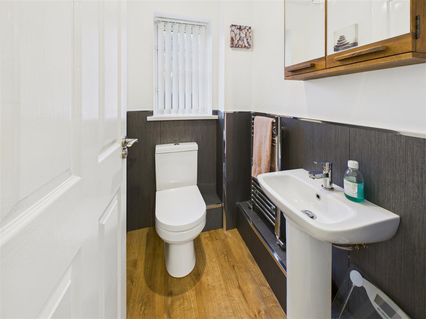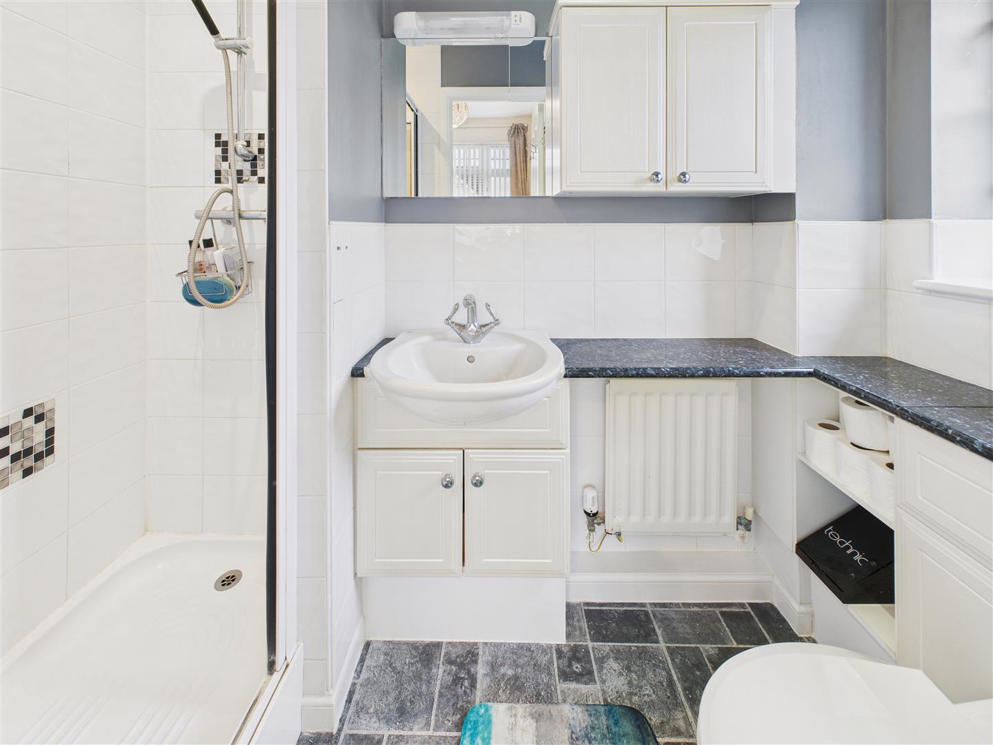 Bathroom - With modern suite comprising a shaped bath with shower over and screen, wash hand basin and low flush W.C. Heated towel rail and window to rear.