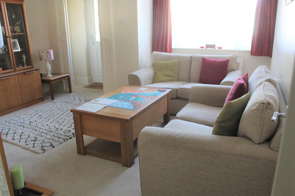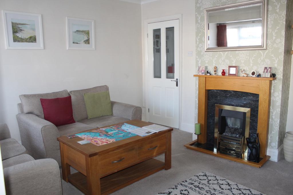13"5 X 13"5 (into bay): Double glazed window to front. Painted walls with papered feature chimney breast and carpeted flooring. Coal effect gas fire with wooden fireplace, one ceiling light and recessed spotlights in the bay area, coving, power points and door to kitchen.