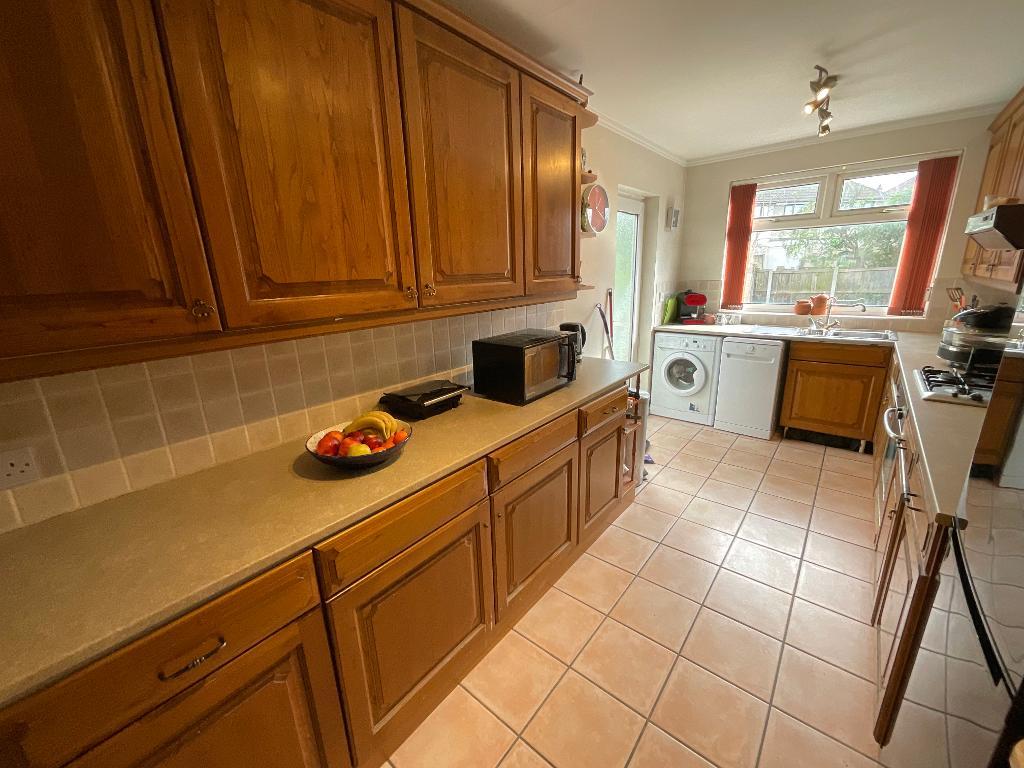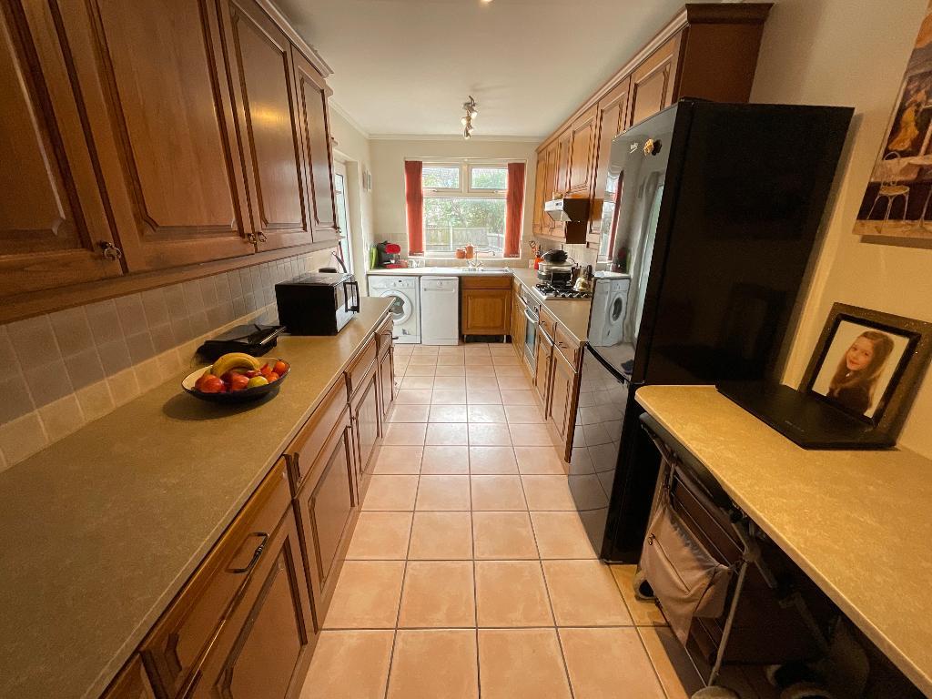 The kitchen is a fantastic size and has a range of eye and base level fitted wooden units and cream marble effect worktops. There is also a fitted oven hob and extractor fan along with tiled flooring and tiled around worktops areas. To the rear of the space there is a stainless-steel sink which has a mixer tap as well as a double-glazed window that looks out onto the rear garden, access to the rear garden is given by a door to the side of the space.