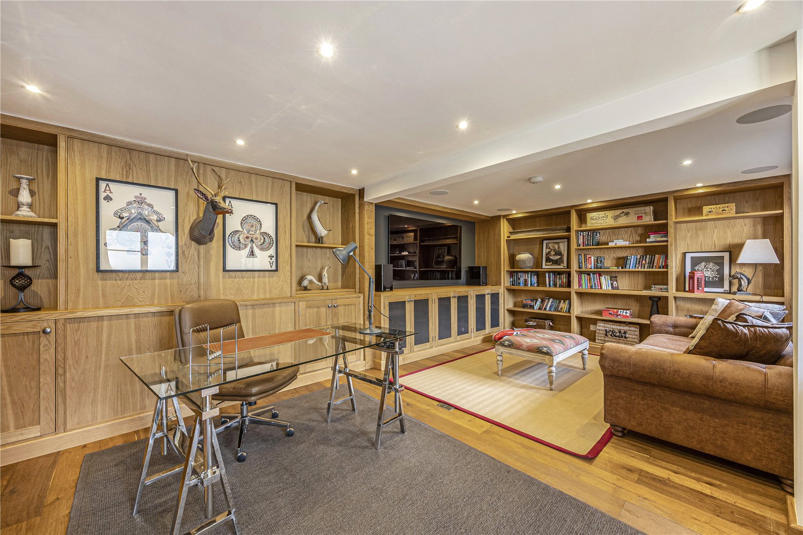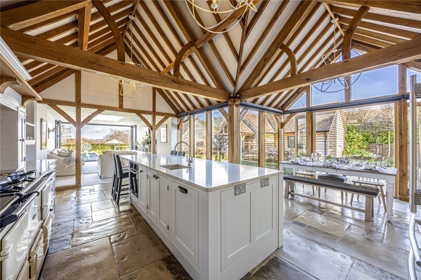 To the rear lies the heart of the home; a magnificent open plan kitchen and dining room for sociable living. Floor-to-ceiling glazing frames the gardens, while a vaulted ceiling with exposed beams introduces character and architectural interest. The kitchen is thoughtully appointed