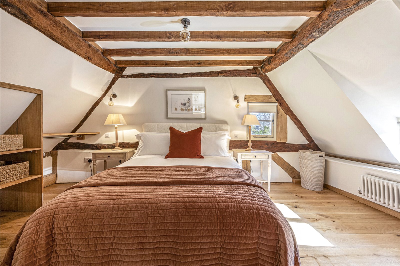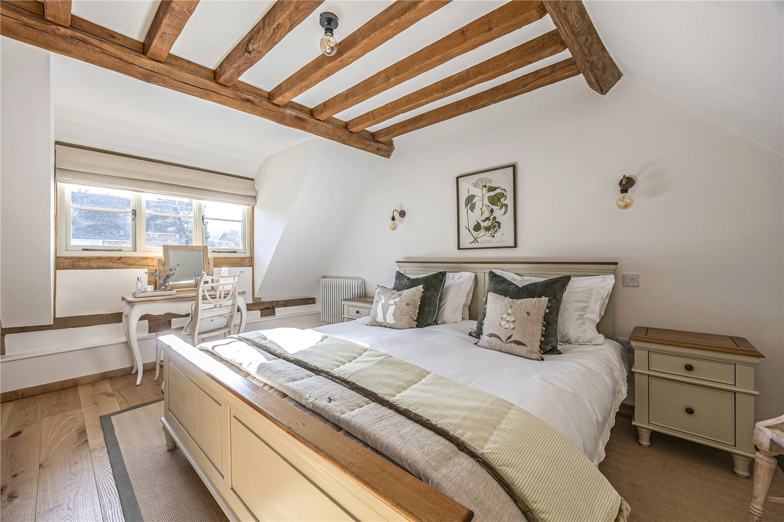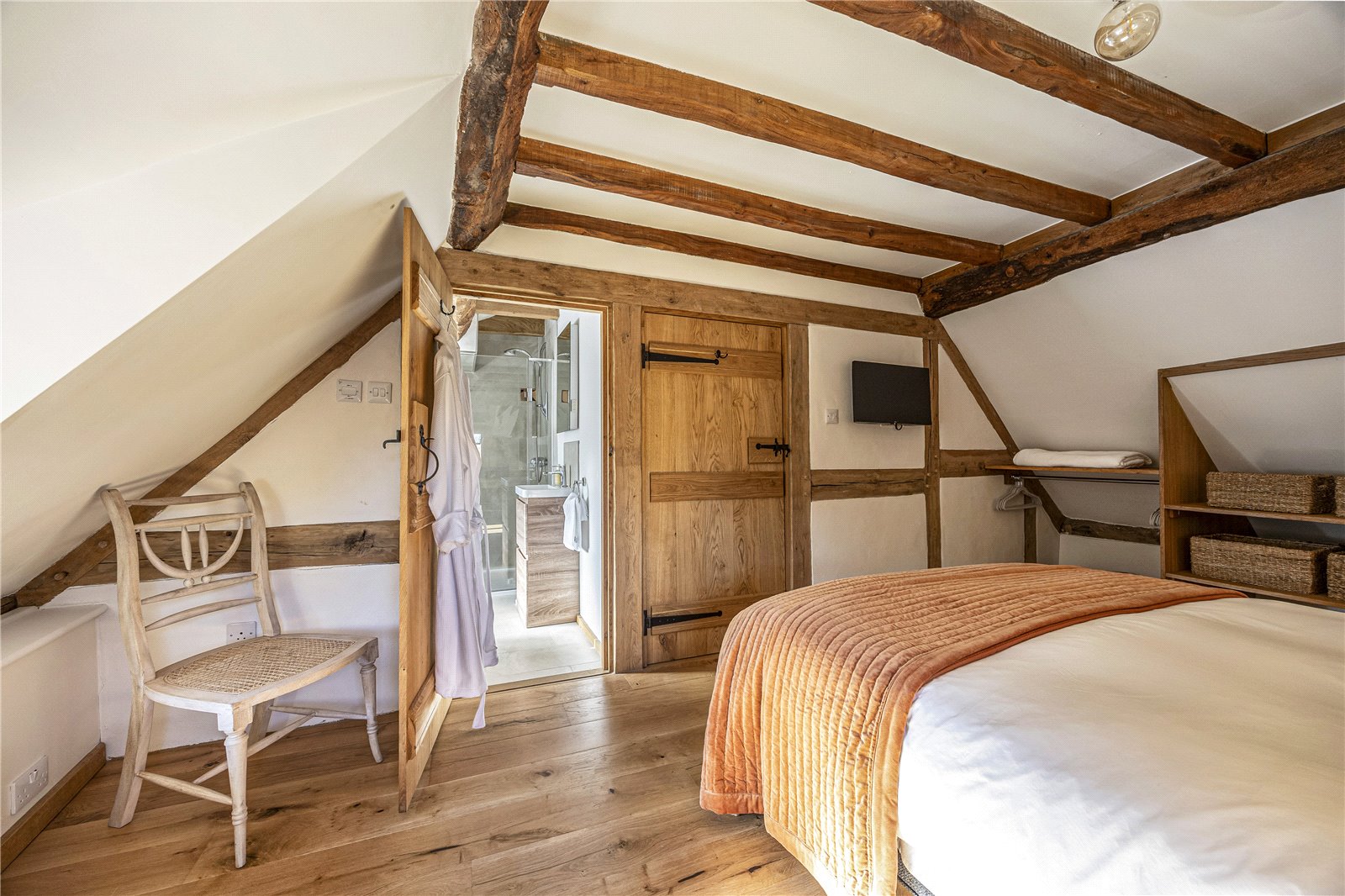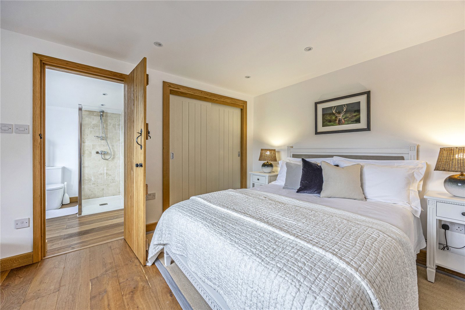 The first floor continues the blend of period charm and modern comfort. Two generously proportioned double bedrooms feature exposed beams, engineered oak flooring and beautifully appointed en-suite bathrooms with contemporary white suites and walk-in showers, offering both privacy and luxury.