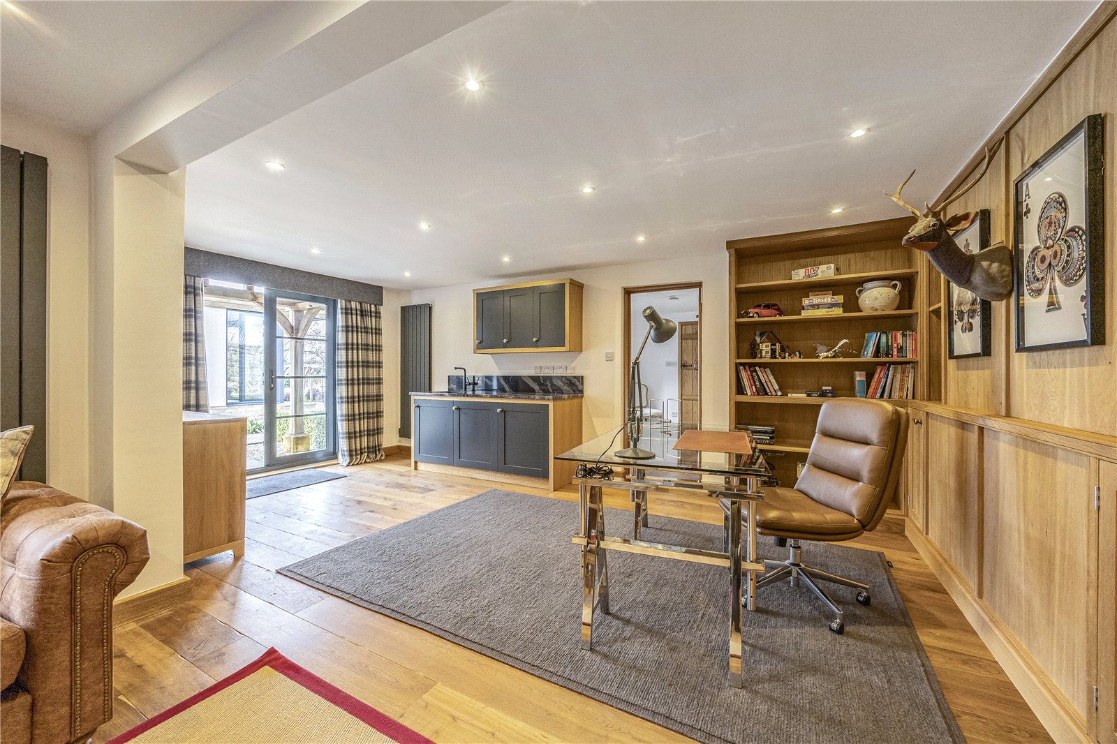 with an electric AGA, integrated appliances including a Miele oven and dishwasher, and a bespoke pantry with a Zip hot and cold tap, leading to a separate utility room. Extending from the kitchen, a garden room with a roof lantern and elegant bi-fold doors seamlessly connects the interior to the grounds, ideal for family living and entertaining.