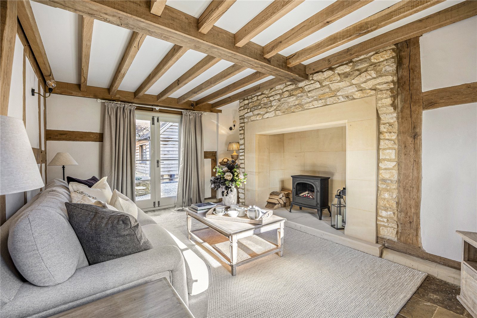 A welcoming entrance hall provides access to a cloakroom and the principal reception rooms. The drawing room is characterful and an inviting space centred around an electric log burner in an impressive inglenook fireplace, with exposed beams, enhancing its warmth and heritage. Patio doors open onto the rear terrace, filling the room with natural light and offering a peaceful retreat. The sitting room, equally rich in period detail, provides a comfortable and sociable environment, with a beautifully crafted oak staircase rising to the first floor.