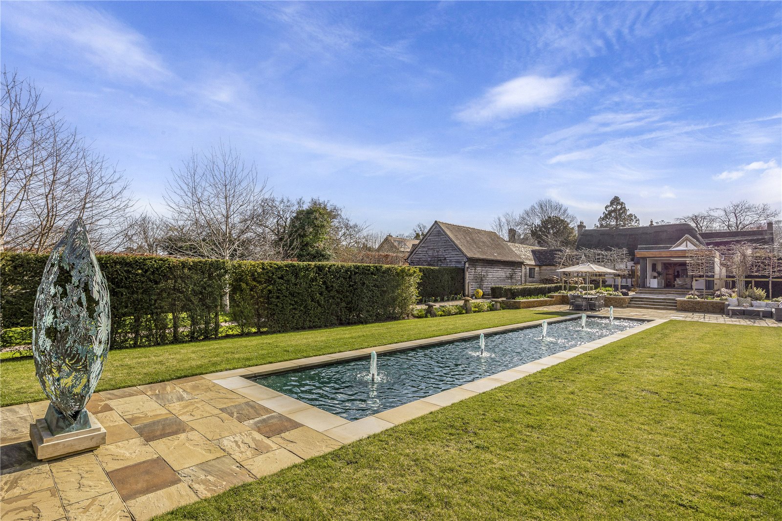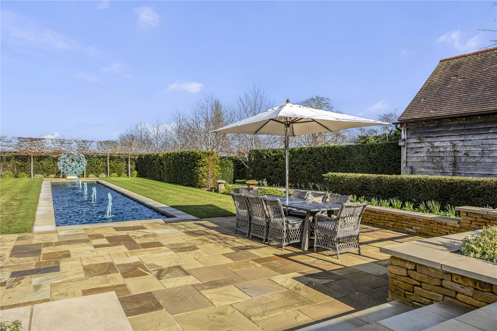 with gentle fountains. Structured planting, pleached trees and well stocked borders provide colour and texture throughout the seasons, while the more open areas of the approximately 2.5 acre plot ensure privacy, space and a tranquil setting.