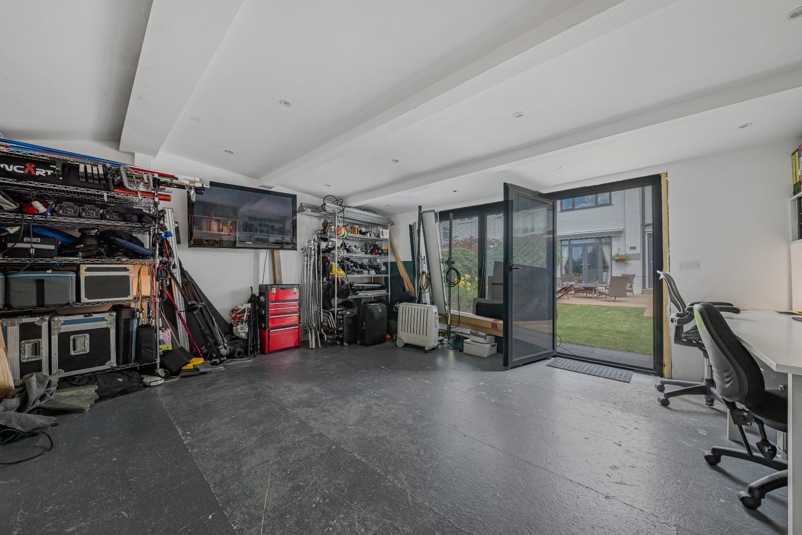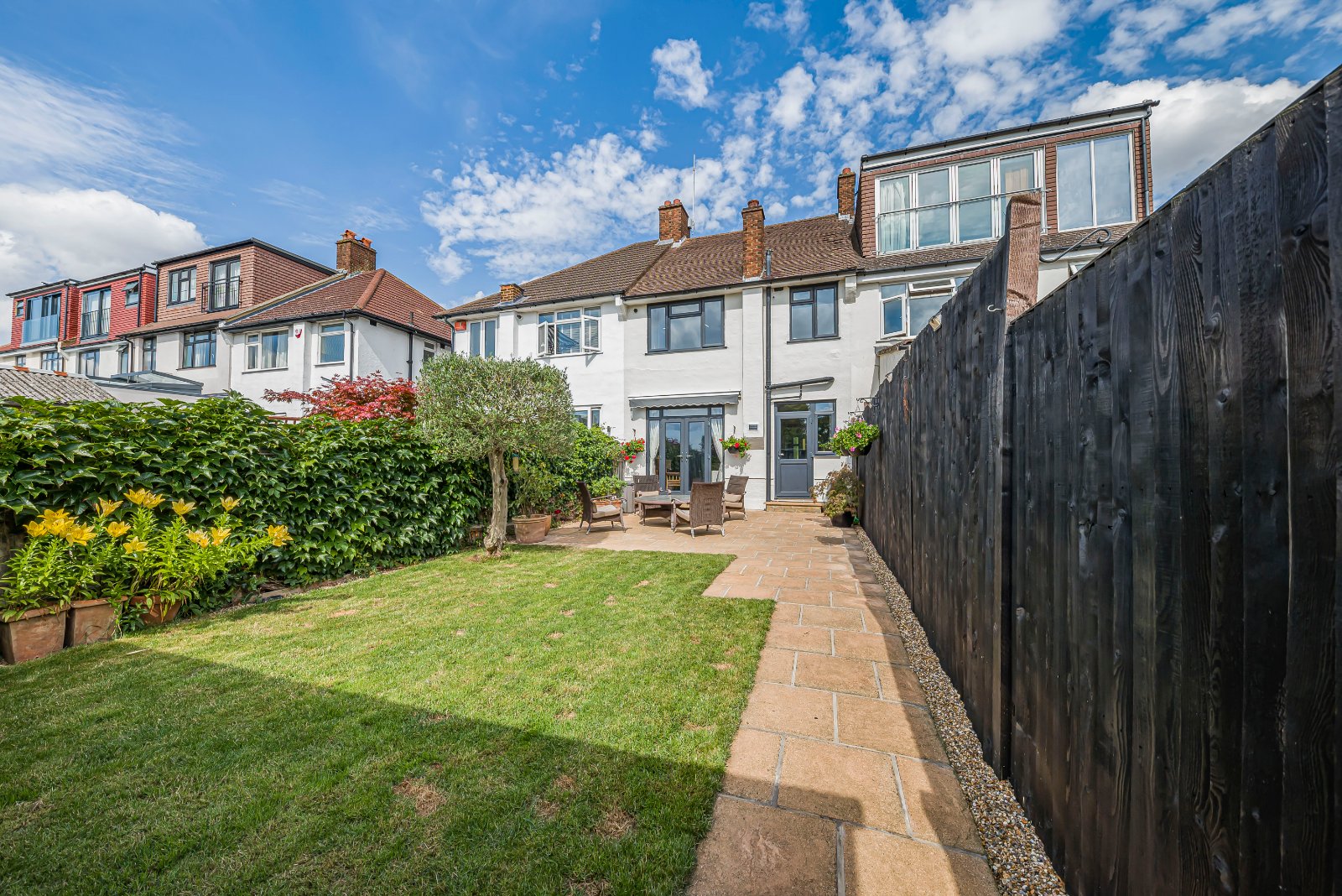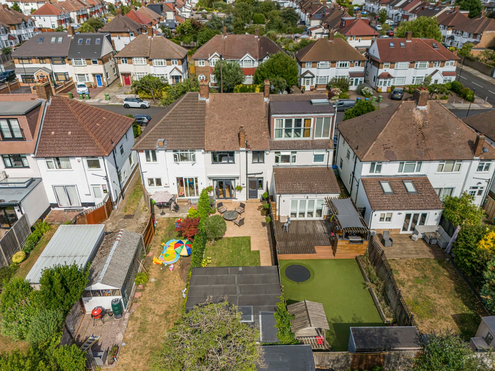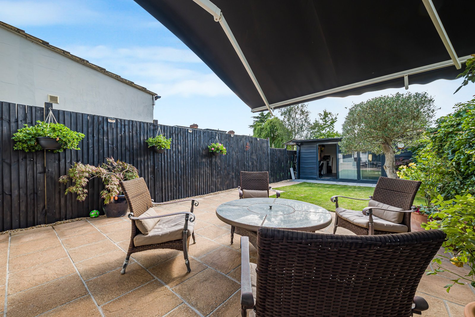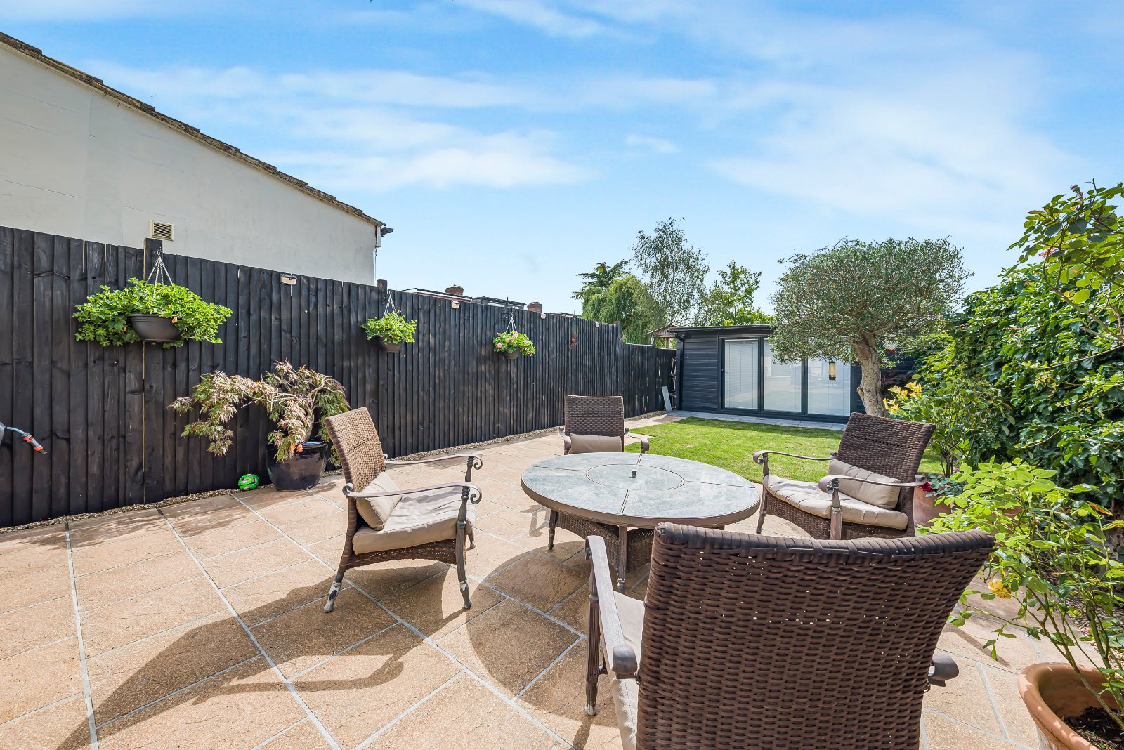 The west-facing rear garden is a real feature of the home, offering a peaceful retreat bathed in afternoon and evening sunshine. At the end of the garden sits a purpose-built outbuilding, a versatile space that could serve as a home office, gym, studio, or workshop—perfect for today’s flexible lifestyles.