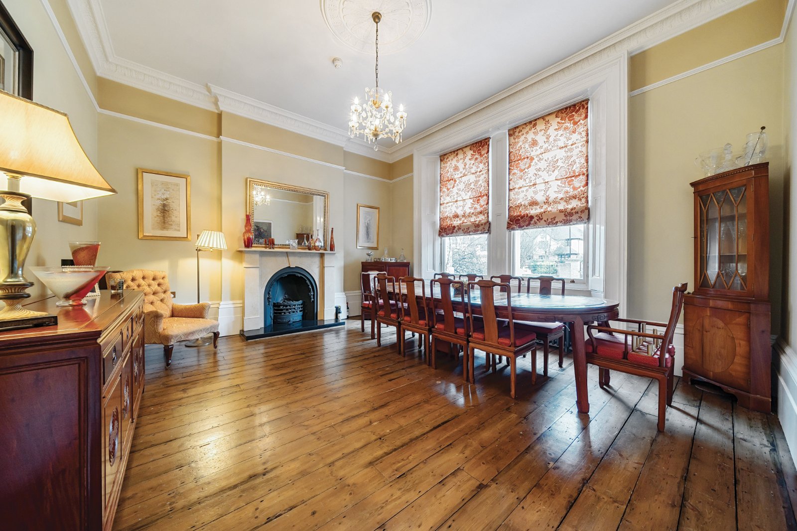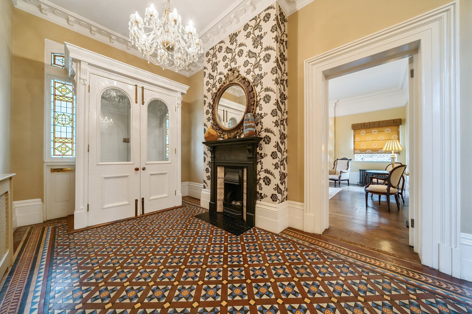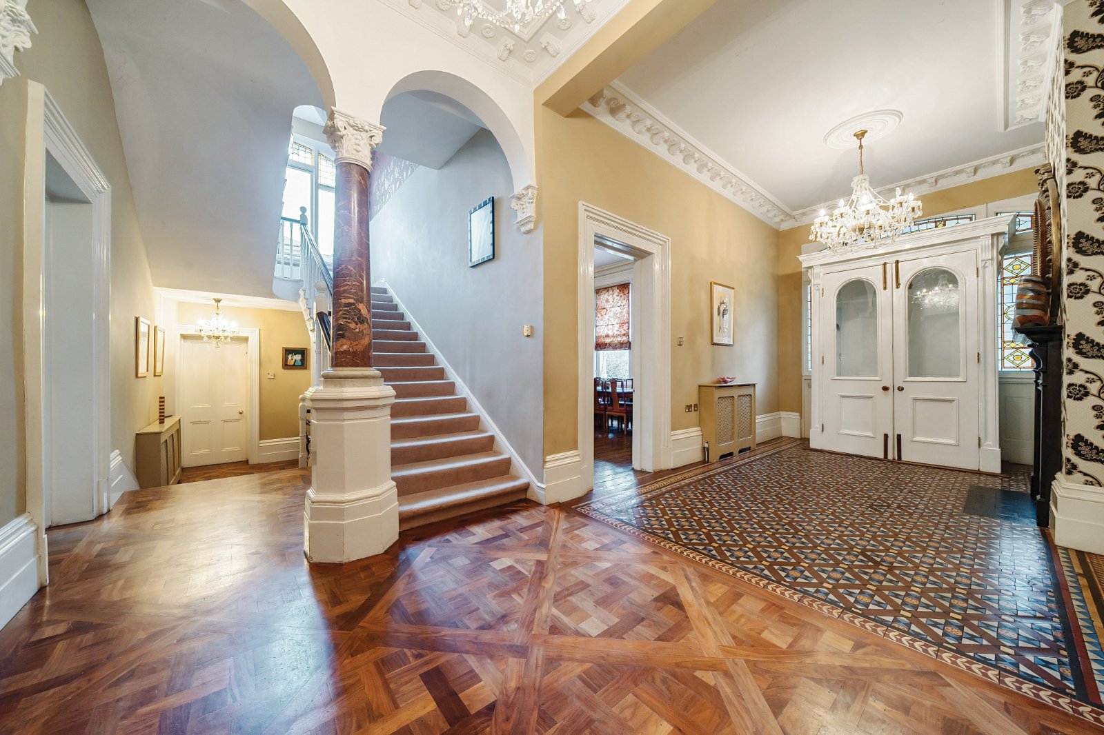 Occupying one of the most generous plots on Court Road—arguably in all of Eltham—Cathay House commands attention with its stunning façade, proudly standing across four floors. The property extends to approximately 9,588 square feet (including the coach house), offering an extraordinary amount of living space. The main house boasts six expansive double bedrooms, ten reception rooms, and seven bathrooms, each exuding timeless character and charm. The grand entrance hall, adorned with exquisite original marble columns and striking tiled flooring, sets the tone for the sheer elegance found throughout.