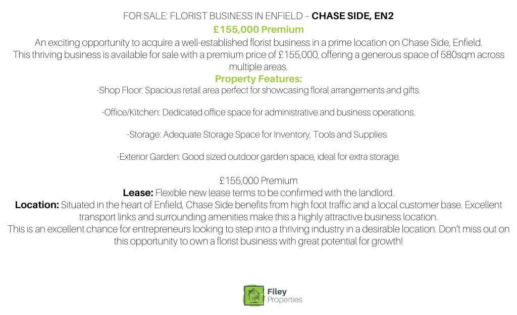 An exciting opportunity to acquire a well-established florist business in a prime location on Chase Side, Enfield.