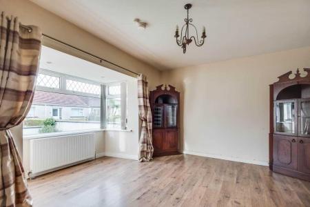 Into Bay Window, hardwood fireplace surround with marble inset & hearth, laminate flooring.