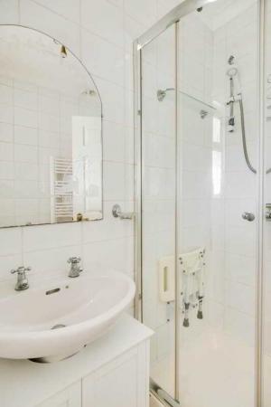White suite, step in shower cubicle with electric shower, fully tiled, ceiling cornice, heated towel rail.