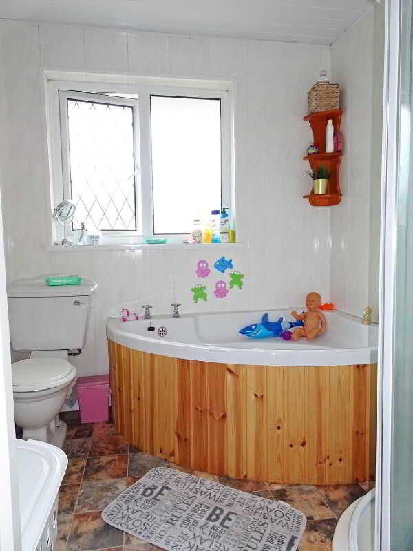 White suite, step in shower cubicle with electric shower, corner bath, PVC cladding to wall & ceiling.