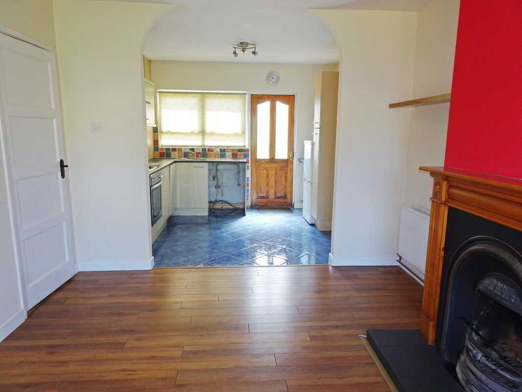Solid wood fireplace surround, cast iron inset & tiled hearth, laminated floor.