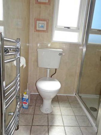 PVC cladding to walls, tiled floor, wc, whb, shower cubicle with electric shower fitting.