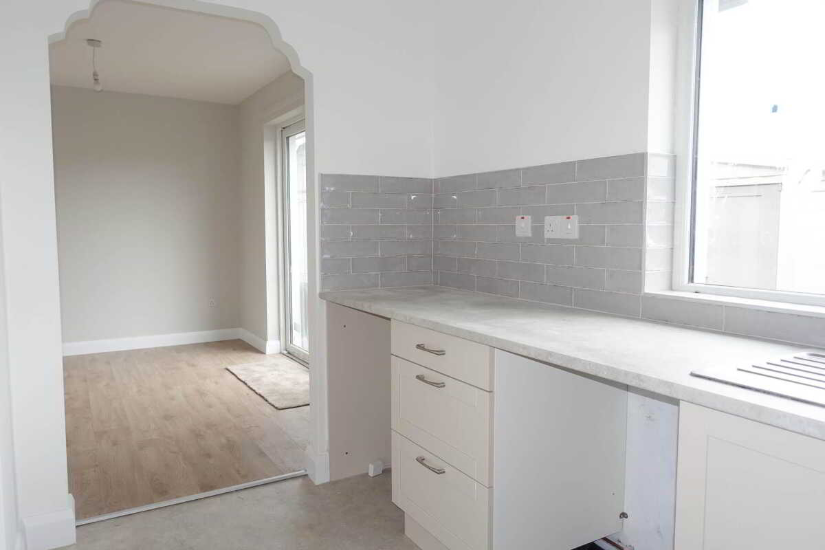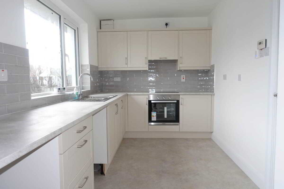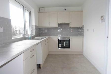 Newly fitted kitchen with a range of high & low level units, integrated electric hob, oven & grill, plumbed for washing machine, extractor fan hood, tiled splash back