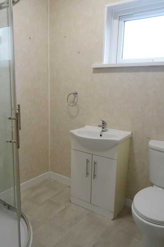 & 2`9 x 2`4 White suite, step in shower cubicle, electric shower, vanity unit, pvc protective wall & ceiling cladding