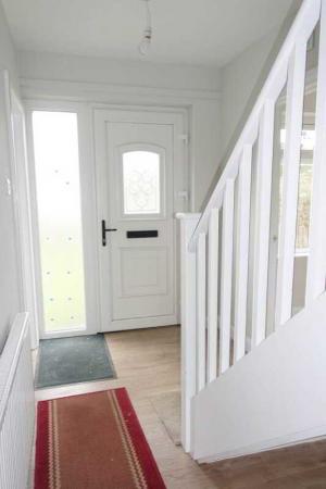 PVC exterior door with glazed inset & side screen, laminate flooring, cloaks cupboard, Hotpress