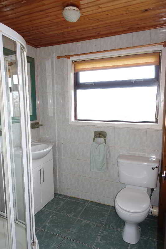 White suite inc step in shower cubicle with electric shower, tiled floor & walls, panelled ceiling.