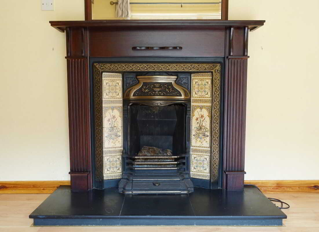 Traditional style fireplace surround with cast iron & tiled inset, Slate hearth, laminate flooring, partially glazed doors to Entrance Hall & Porch.