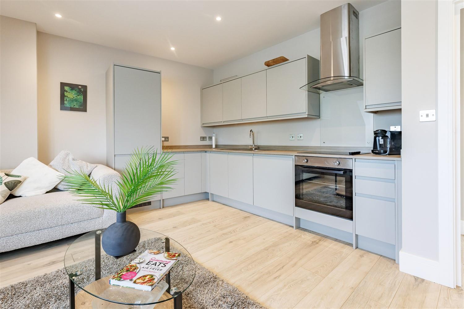 A remote gated entrance with secure video entry welcomes you into the communal hallway, where stairs rise to the upper floors and your own private front door. Inside, a welcoming hallway leads to a sleek shower room with modern tiling and white sanitary ware. The open-plan living space features a fully integrated kitchen finished in stylish grey high-gloss units with contrasting work surfaces and quality appliances, flowing seamlessly into a cosy lounge and dining area-perfect for relaxing or entertaining.