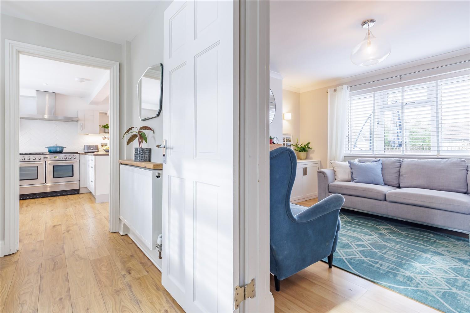 Stepping inside, the welcoming entrance hall flows into a spacious and refurbished kitchen breakfast room, appointed with sleek high-gloss units, ample work surfaces, and a range-style cooker. A breakfast bar and space for a dining table make this the heart of the home, with doors opening directly onto the rear garden - ideal for entertaining or family meals. The inviting living room features a charming fireplace and enjoys views across the garden, while a practical downstairs WC completes the versatile ground floor.