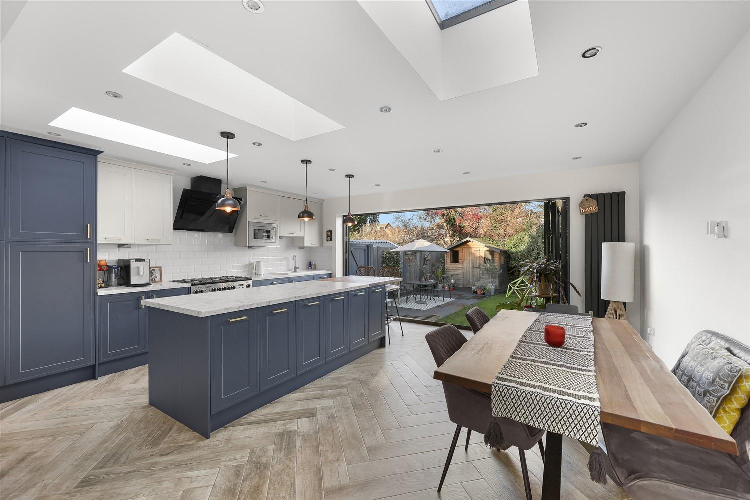 Stepping inside, you are welcomed by a bright entrance hall with a convenient ground-floor cloakroom. The elegant lounge, complete with a charming fireplace, creates a warm and relaxing setting. This room flows effortlessly into a stunning open-plan kitchen and dining area, featuring a beautifully fitted kitchen with integrated appliances. A central breakfast island with a marble worktop and wooden seating area provides the perfect spot for casual dining. Expansive bifold doors open onto the rear garden, flooding the space with natural light and offering seamless indoor-outdoor living.