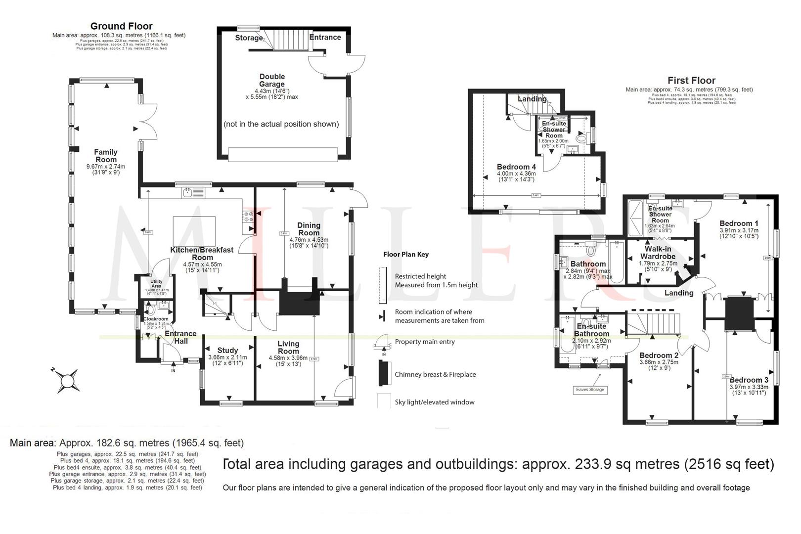 The first floor is home to a luxurious master bedroom complete with a walk-in dressing room and an en-suite bathroom, providing a private retreat. Two further double bedrooms, one with its own en-suite, and a family bathroom ensure ample accommodation for family and guests.