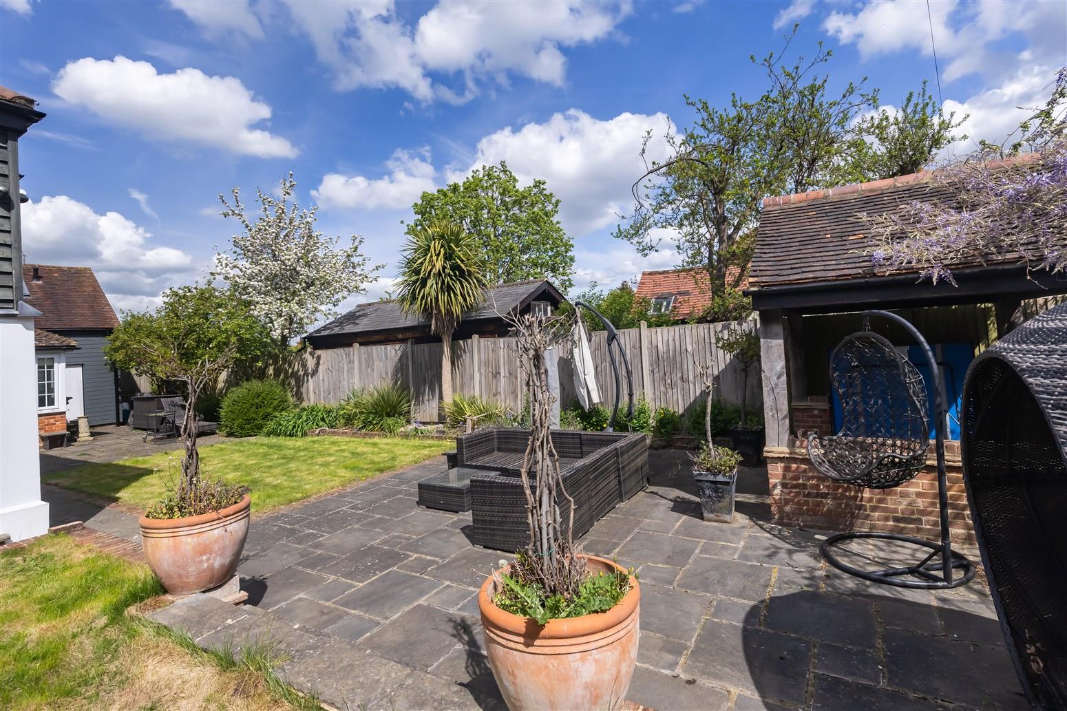 The rear garden wraps around the home, offering a splendid outdoor space ideal for alfresco dining and entertaining. With various lawned and patio areas, this garden is a true oasis for relaxation and enjoyment. This property is a rare find, combining space, style, and a prime location, making it a must-see for discerning buyers.