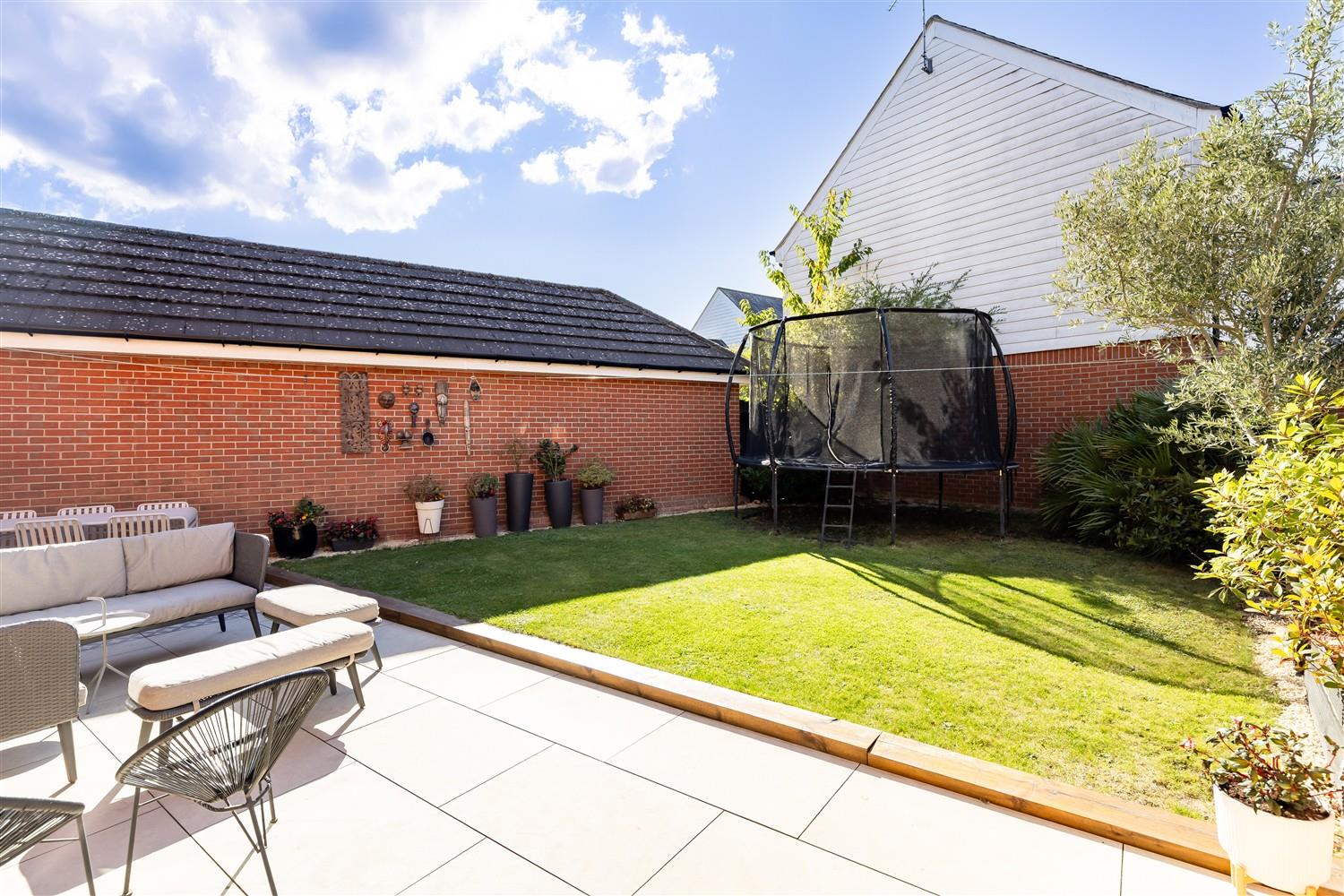 The garden is a tranquil oasis, laid to lush lawn and featuring a beautifully elegant porcelain patio - an ideal space for alfresco dining. A side plot provides additional storage options or potential to extend (subject to planning). Convenient side access leads to the double carport, offering secure and covered parking.
