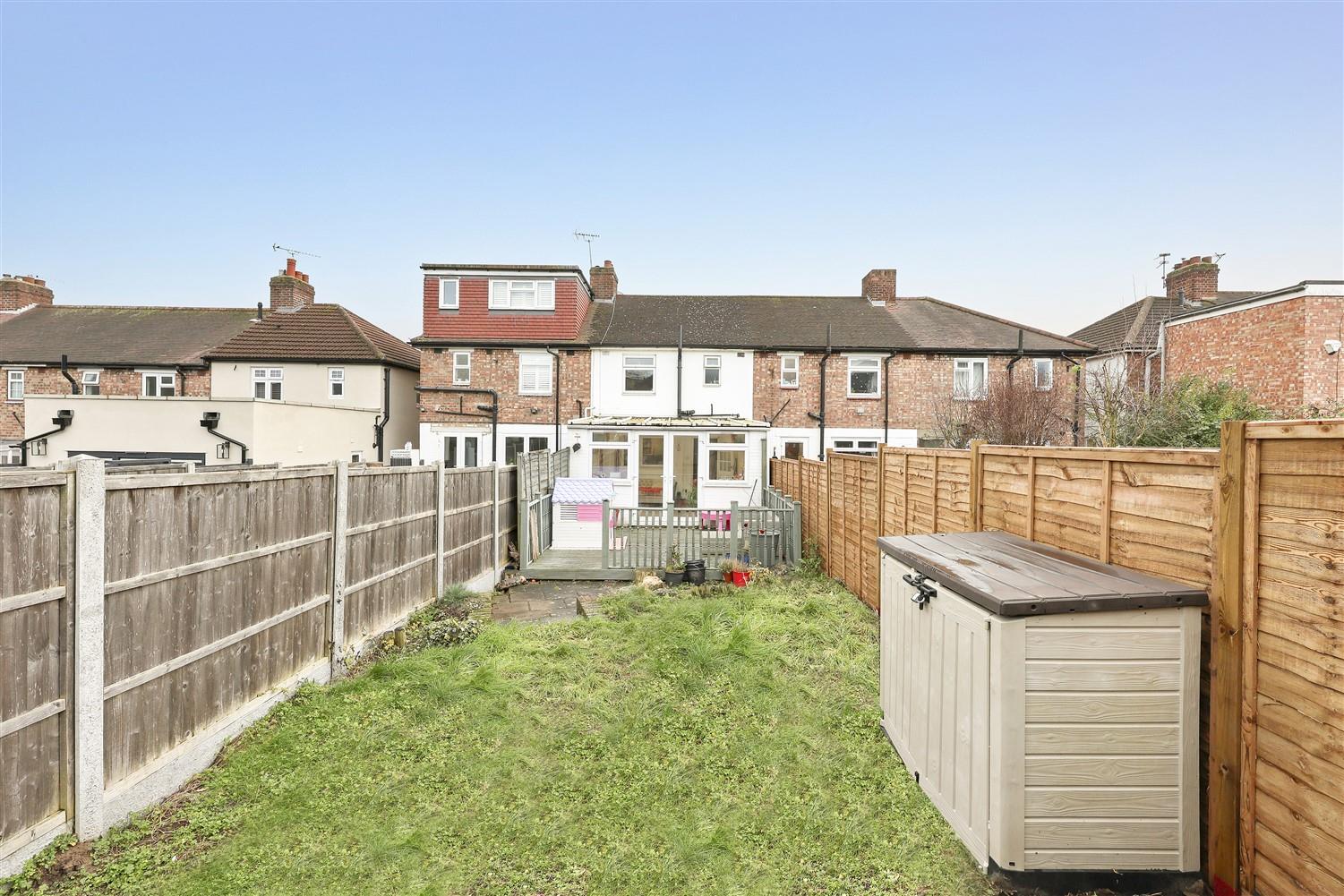 The rear garden features a decked patio ideal for alfresco dining in the warmer months while the rest of the garden is laid to lawn, providing a pleasant green space for leisure or play. A garden shed offers useful extra storage, and convenient rear access completes the picture.