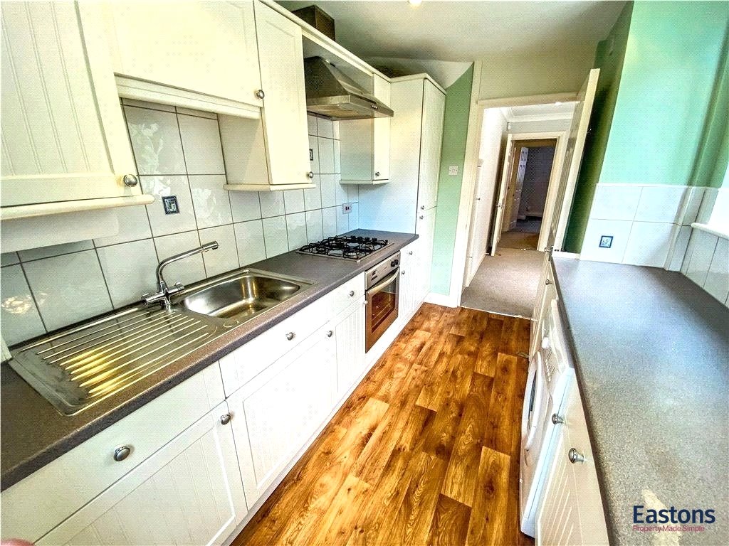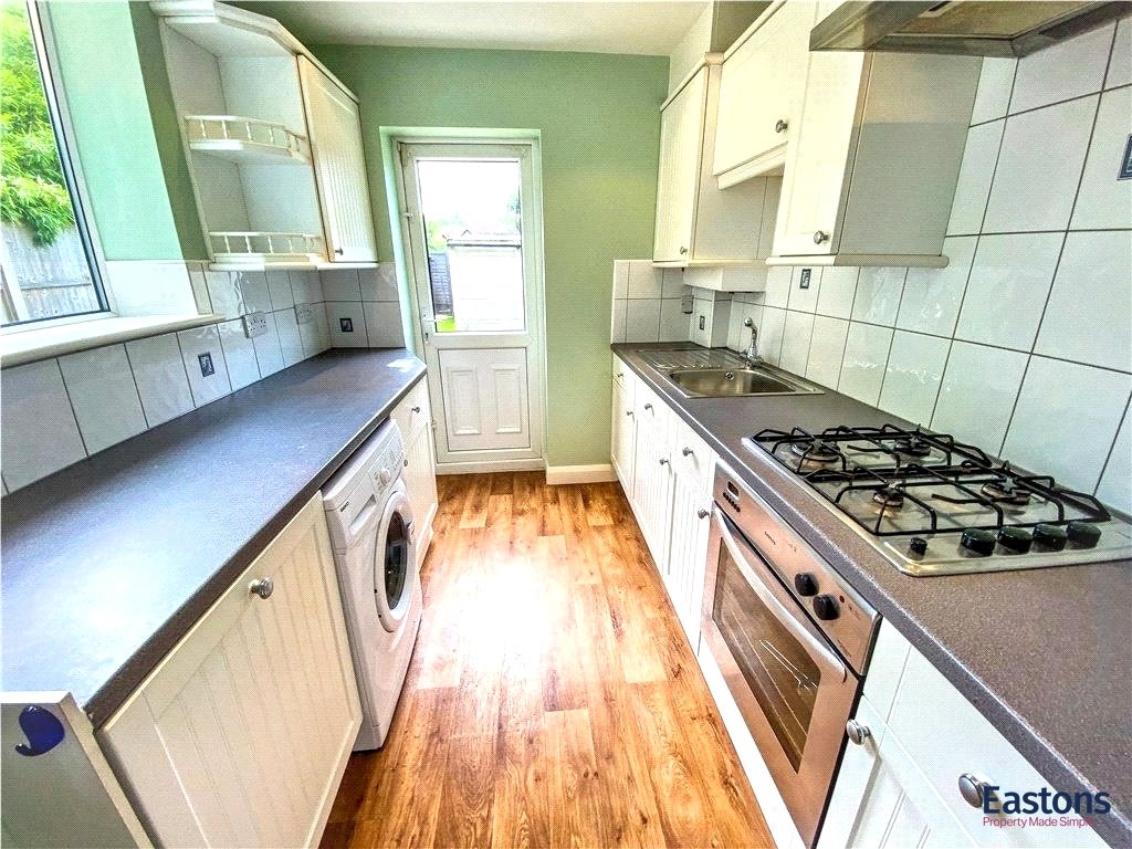 The accommodation comprises of an entrance hallway leading to a garden-facing reception room, featuring double French doors opening onto a patio and private garden. The fitted kitchen offers a matching range of base and wall units, an integrated four-burner gas hob with extractor hood and oven below, as well as an integrated fridge/freezer and dishwasher. There is also space for a washing machine and a rear door providing direct access to the garden.