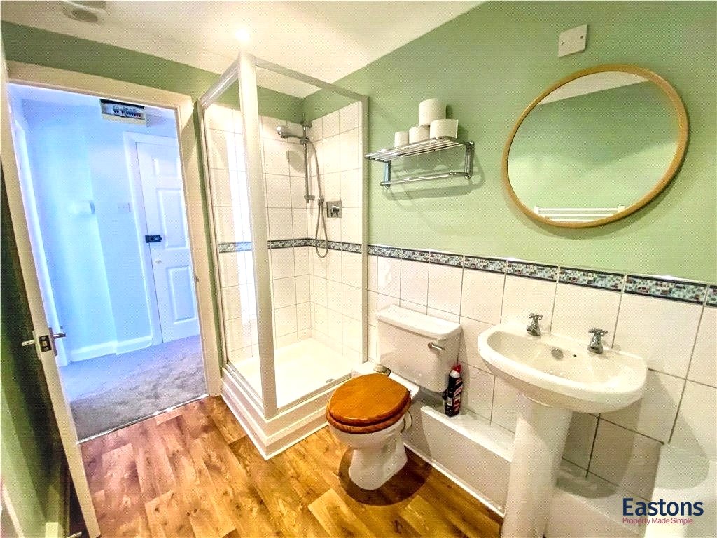 The double bedroom benefits from full-width built-in wardrobes, while the spacious bathroom is fitted with a white suite comprising a panel-enclosed bath, low-level WC, pedestal wash hand basin, and a separate shower cubicle.