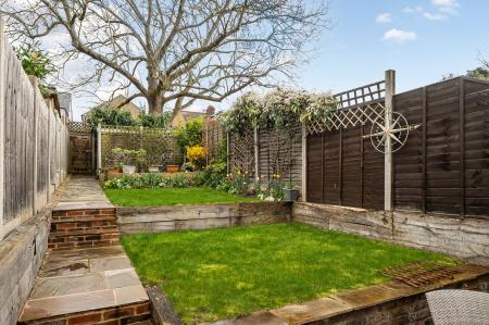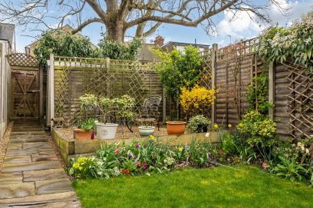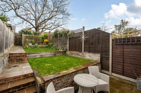 Outside, the attractive rear garden features a small patio area, ideal for enjoying a morning coffee, with steps leading up to a lawn bordered by established planting. To the front, there is a neatly presented garden enclosed by a low brick retaining wall.