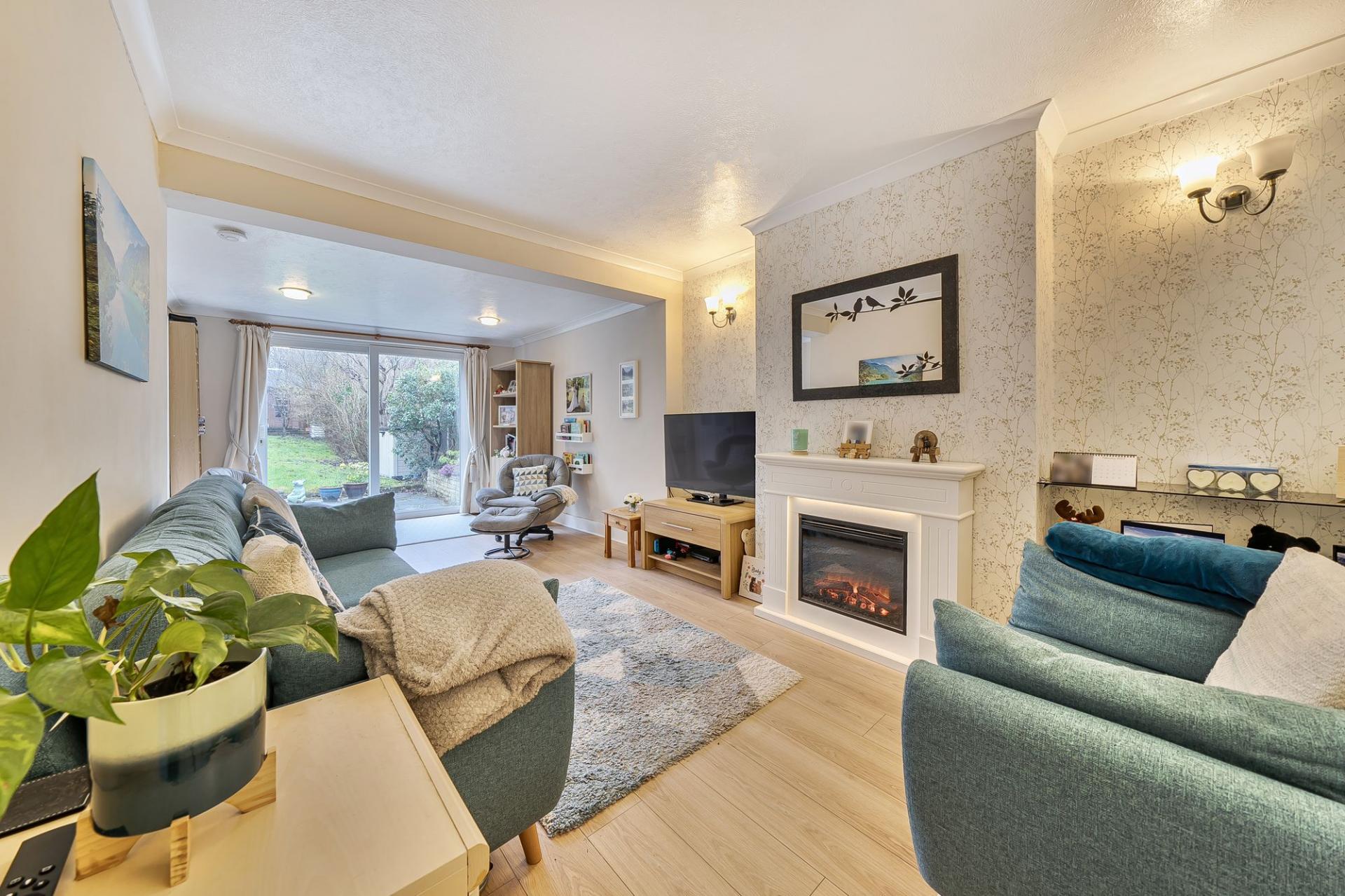To the rear, the property enjoys a generous garden backing onto open common land, offering a high degree of privacy, ideal for outdoor entertaining, children’s play, or simply unwinding. A driveway to the front provides off-street parking for one vehicle.