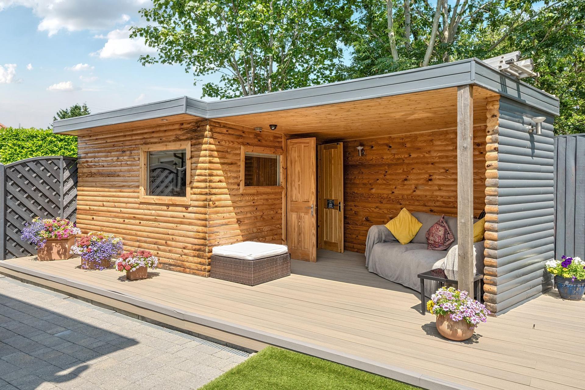- Rear Garden With Wooden Cabin/Bar & Astro Turf Lawn