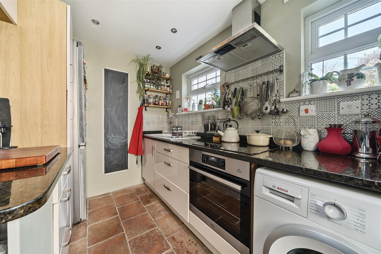 On the other side of the entrance is the dining room and semi-open plan kitchen. The kitchen has been cleverly designed to maximise its space with a range of base and elevated storage; the peninsula island brings a very sociable flow to this room as well. A perfectly positioned sky-light, double rear windows and side door leading to the garden's private, sunken patio area, truly brightens this space.