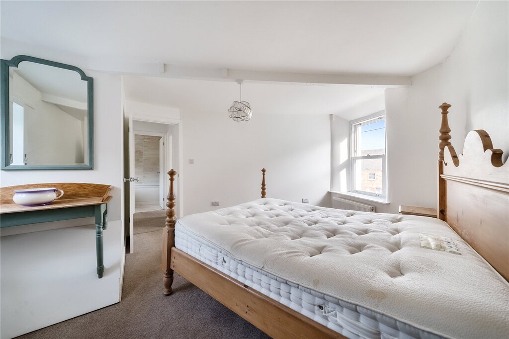 Bedroom 1 has a dual aspect with views over the square. Bedroom 2 has a front aspect with views over the square and a built-in cupboard. The contemporary bathroom is arranged with a bath, with shower overhead, wc and basin.
