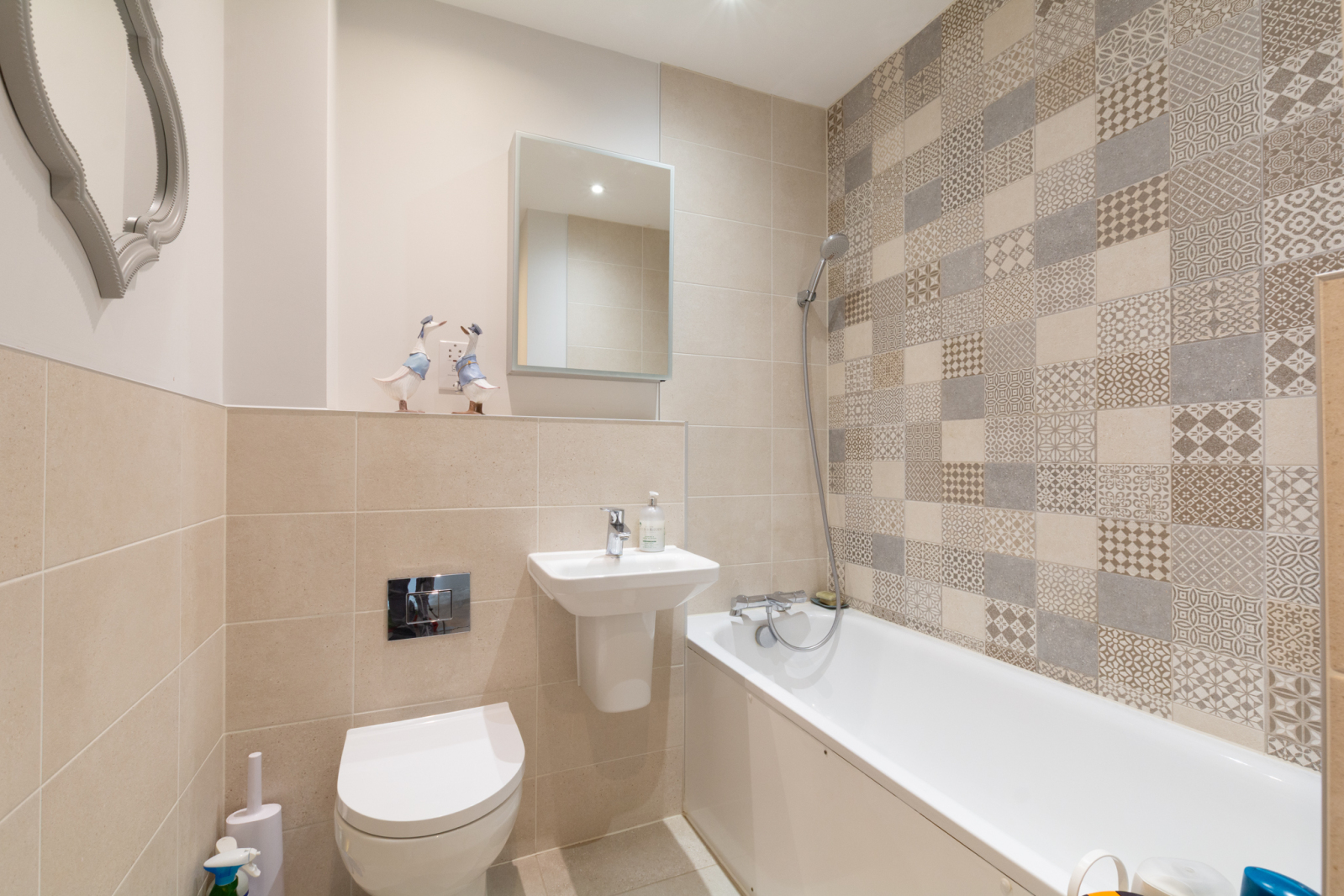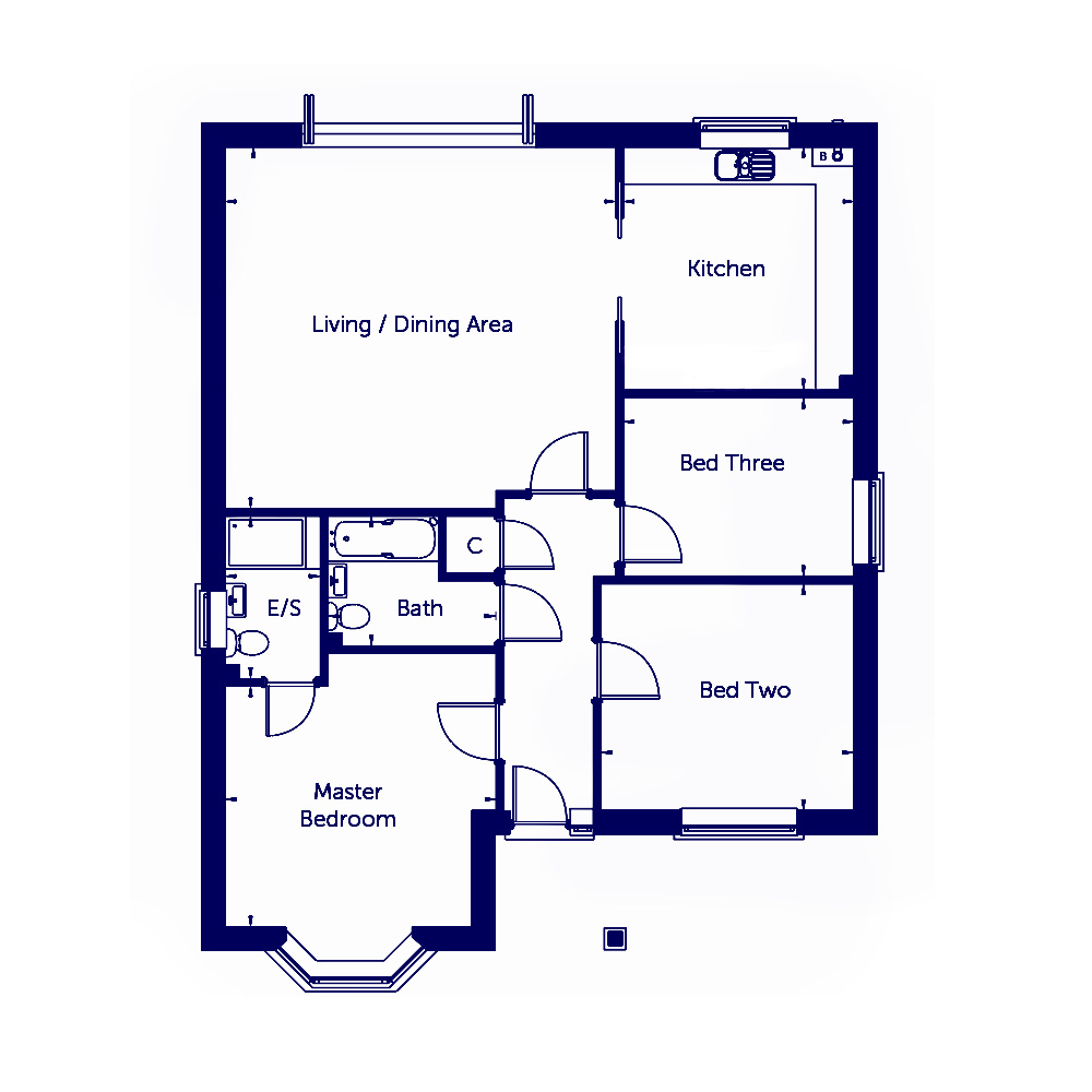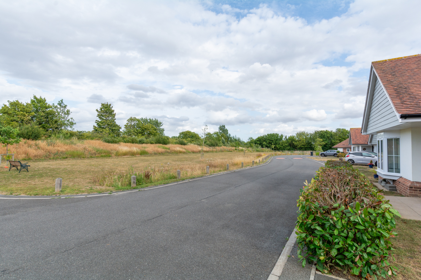 The principal bedroom enjoys a bay window overlooking a peaceful greensward to the front and includes ample space for freestanding wardrobes along with a high-quality en-suite shower room. The second bedroom is a comfortable double, while the third makes an ideal guest room or study, complete with fitted wardrobes/storage. The family bathroom is finished with attractive tiling and a bath with shower attachment.